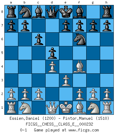 Last move : 0-1 2020 July 7 19:3:16 [Event "FICGS__CHESS__CLASS_E__000232"] [Site "FICGS"] [Date "2020.05.27"] [Round "1"] [White "Essien,Daniel"] [Black "Pintor,Manuel"] [Result "0-1"] [WhiteElo "1200"] [BlackElo "1510"] 1.d4 d5 2.Bf4 c6 3.e3 Nf6 0-1 This chess game has been lost on time (started : 2020.05.27 12:47:44) Queen's pawn, Mason variation Player Black won this chess game. Follow this game move after move (download)It's just you and your opponent at the board and you're trying to prove something. (Bobby Fischer) Darum geht es im Schach. Einen Tag gibst du deinem Gegner eine Lektion, am nächsten Tag gibt er dir eine. (Robert James Fischer) Los tropiezos estan todos ahí en el tablero, esperando que se cometan. (Savielly Tartakover) La solitude du joueur d'Echecs à l'approche du mat est semblable à celle du condamné. (Francis Szpiner) The right perception of any matter and a misunderstanding of the same matter do not wholly exclude each other. (Kafka's the trial)