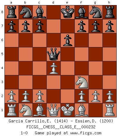Last move : 1-0 2020 July 7 5:41:40 [Event "FICGS__CHESS__CLASS_E__000232"] [Site "FICGS"] [Date "2020.05.27"] [Round "1"] [White "Garcia Carrillo,Exal"] [Black "Essien,Daniel"] [Result "1-0"] [WhiteElo "1414"] [BlackElo "1200"] 1.e4 d5 2.Nf3 e6 3.exd5 Qxd5 4.d4 1-0 This chess game has been lost on time (started : 2020.05.27 12:47:44) Scandinavian (centre counter) defense Player White won this chess game. Follow this game move after move (download)Best by test: 1. e4 (Bobby Fischer) Oft bringt ein stiller Zug das Erdbeben. (Richard Reti) Tu no necesitas jugar muy bien, únicamente ayudar a tu oponenet a que juegue muy mal. (Genrikh Chepukaitis) Vouloir jouer aux échecs contre soi-même est aussi paradoxal que vouloir marcher sur son ombre. (Stefan Zweig) Do not put your faith in what statistics say until you have carefully considered what they do not say. (William W. Watt)