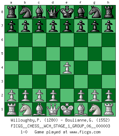 Last move : 1-0 2007 August 8 8:57:17 [Event "FICGS__CHESS__WCH_STAGE_1_GROUP_06__000003"] [Site "FICGS"] [Date "2007.07.11"] [Round "1"] [White "Willoughby,Peter"] [Black "Boulianne,Gabriel"] [Result "1-0"] [WhiteElo "1280"] [BlackElo "1552"] 1.e4 1-0 King's pawn Opening Player White won this chess game. Follow this game move after move (download)The mistakes are there, waiting to be made. (Savielly Tartakower) Wenn du nicht weißt was du tun sollst, warte bis dein Gegner eine Idee hat. Sie wird sicher schlecht sein. (Siegbert Tarrasch) El Ajedrez es un invernadero donde los frutos del carácter pueden madurar mas completamente que en la vida. (Edward Morgan Foster) La tactique, c'est ce que vous faites quand il y a quelque chose à faire; la stratégie, c'est ce que vous faites quand il n'y a rien à faire. (Savielli Tartacower) Thibault, I ask for draw. Game 13876. - Sorry Ilmars, you won. (FICGS chat)