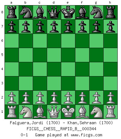 Last move : 0-1 2020 June 27 18:11:27 [Event "FICGS__CHESS__RAPID_B__000344"] [Site "FICGS"] [Date "2020.05.28"] [Round "1"] [White "Falguera,Jordi"] [Black "Khan,Sehraan"] [Result "0-1"] [WhiteElo "1700"] [BlackElo "1700"] 0-1 This chess game has been lost on time (started : 2020.05.28 11:5:55) Player Black won this chess game. Follow this game move after move (download)I look one move ahead... the best ! (Siegbert Tarrasch) Alles was ich jemals tun will ist Schach spielen. (Robert James Fischer) No es tiempo de jugar al Ajedrez cuando la casa esta en llamas. (Proverbio Italiano) L'action d'une oeuvre littéraire se déroule sur un champ de bataille. Les masques et les types du drame moderne correspondent aux pièces du jeu d'échecs. L'intrigue correspond aux coups et aux gambits, c'est à dire aux techniques du jeu telles qu'utilisées et interprétées par les joueurs. Les tactiques et les péripéties [mouvements] correspondent aux coups exécutés par l'adversaire. (Viktor Shklovsky) Unless in communicating with it one says exactly what one means, trouble is bound to result. (Alan Turing, about computers)