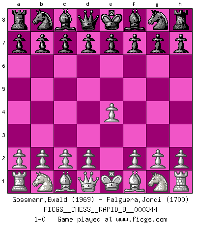 Last move : 1-0 2020 June 27 18:11:27 [Event "FICGS__CHESS__RAPID_B__000344"] [Site "FICGS"] [Date "2020.05.28"] [Round "1"] [White "Gossmann,Ewald"] [Black "Falguera,Jordi"] [Result "1-0"] [WhiteElo "1969"] [BlackElo "1700"] 1.e4 1-0 This chess game has been lost on time (started : 2020.05.28 11:5:55) King's pawn Opening Player White won this chess game. Follow this game move after move (download)If I win a tournament, I win it by myself. I do the playing. Nobody helps me. (Bobby Fischer) Ich würde die 30 stärksten Spieler der USA im Simultanspiel besiegen. (José Raúl Capablanca) Los libros de Ajedrez deben de usarse igual como usamos los anteojos: para mejorar la vista, aunque algunos jugadores los quieren usar como si ellos les otorgaran la vision. (José Raúl Capablanca) Le jeu d'échecs est comme rejeté hors du temps. (Antoine de Saint-Exupéry) Whatever you do, don't be bored. This is absolutely the most exciting time we could have possibly hoped to be alive. And things are just starting. (From movie Waking life)