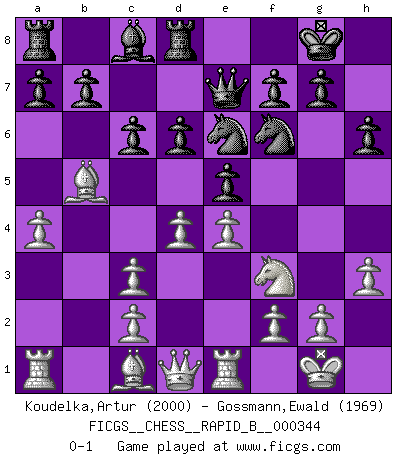 Last move : 0-1 2020 July 12 3:21:37 [Event "FICGS__CHESS__RAPID_B__000344"] [Site "FICGS"] [Date "2020.05.28"] [Round "1"] [White "Koudelka,Artur"] [Black "Gossmann,Ewald"] [Result "0-1"] [WhiteElo "2000"] [BlackElo "1969"] 1.e4 e5 2.Nf3 Nf6 3.Nc3 Nc6 4.Bb5 Bb4 5.O-O O-O 6.d3 d6 7.Bg5 Bxc3 8.bxc3 Qe7 9.Re1 Nd8 10.d4 Ne6 11.Bc1 Rd8 12.a4 h6 13.h3 c6 0-1 This chess game has been lost on time (started : 2020.05.28 11:5:55) Petrov Three knights game Kingside Castling by player White (move 5) Kingside Castling by player Black (move 5) Player Black won this chess game. Follow this game move after move (download)The game of chess is the touchstone of the intellect. (Goethe) Er war ein guter Schachspieler, aber ich kann Leute nicht ausstehen, die 'Heil Hitler' rufen (Über Alexander Aljechin). (Miguel Najdorf) Sin errores no puede haber brillantez. (Emanuel Lasker) Pour se monter efficace, un Cavalier a besoin d'avant-postes ! Les Cavaliers font les meilleurs bloqueurs de pions passés. The large trees attract high winds. (Chinese proverb)