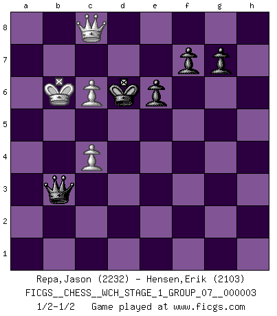 Last move : 1/2-1/2 2007 August 9 7:13:29 [Event "FICGS__CHESS__WCH_STAGE_1_GROUP_07__000003"] [Site "FICGS"] [Date "2007.07.11"] [Round "1"] [White "Repa,Jason"] [Black "Hensen,Erik"] [Result "1/2-1/2"] [WhiteElo "2232"] [BlackElo "2103"] 1.e4 c5 2.Nf3 d6 3.d4 cxd4 4.Nxd4 Nf6 5.Nc3 a6 6.Be3 e6 7.f3 b5 8.Qd2 Nbd7 9.g4 Nb6 10.O-O-O Nfd7 11.Ndxb5 axb5 12.Nxb5 Be7 13.Nxd6+ Kf8 14.Kb1 Qc7 15.b3 Ne5 16.Be2 Ba6 17.c4 h5 18.gxh5 Rxh5 19.c5 Nec4 20.Nxc4 Nxc4 21.bxc4 Rb8+ 22.Ka1 Bf6+ 23.Bd4 Rd8 24.Qb2 Rxd4 25.Rxd4 Rxh2 26.Rxh2 Qxh2 27.Kb1 Ke7 28.c6 Bxd4 29.Qxd4 Qxe2 30.Qa7+ Kd6 31.Qxa6 Qe1+ 32.Kc2 Qe2+ 33.Kb3 Qxf3+ 34.Kb4 Qxe4 35.Qc8 Qe1+ 36.Kb5 Qb1+ 37.Ka6 Qxa2+ 38.Kb7 Qb3+ 39.Ka7 Qa4+ 40.Kb6 Qb3+ 1/2-1/2 Sicilian : Najdorf, Byrne (English) attack Queenside Castling by player White (move 10) 10 pieces endgame at move 34 : White KQPPP , Black KQPPP WHITE : King + 1 Queen 3 Pawns BLACK : King + 1 Queen 3 Pawns 9 pieces endgame at move 37 : White KQPP , Black KQPPP WHITE : King + 1 Queen 2 Pawns BLACK : King + 1 Queen 3 Pawns This chess game ended in a draw. Follow this game move after move (download)You sit at the board and suddenly your heart leaps. Your hand trembles to pick up the piece and move it. But what Chess teaches you is that you must sit there calmly and think about whether it's really a good idea and whether there are other better ideas. (Stanley Kubrick) Moralische Siege zählen nicht. (Savielly Grigorievitsch Tartakower) El hombre es un frívolo, una creatura engañosa y como un jugador de Ajedrez, se preocupa mas por el proceso de obtener su meta que de la meta por sí misma. (Dostoyevsky) Ce qui caractérise les parties de combat, c'est que si le défenseur a constamment de difficiles problèmes à résoudre, l'attaquant doit chercher sans relâche de nouvelles possibilités d'attaque. (Koblentz) The arrogant army will lose certainly the battle. (Chinese proverb)