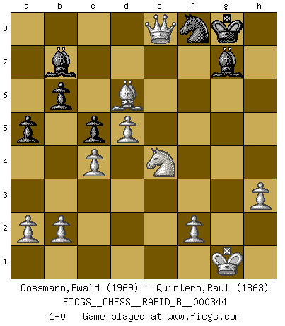 Last move : 1-0 2020 July 1 11:26:58 [Event "FICGS__CHESS__RAPID_B__000344"] [Site "FICGS"] [Date "2020.05.28"] [Round "1"] [White "Gossmann,Ewald"] [Black "Quintero,Raul"] [Result "1-0"] [WhiteElo "1969"] [BlackElo "1863"] 1.e4 b6 2.d4 e6 3.Nf3 Bb7 4.Bd3 Be7 5.O-O d6 6.c4 c5 7.d5 exd5 8.exd5 Nf6 9.Nc3 O-O 10.h3 Nbd7 11.g4 h6 12.Re1 Re8 13.Bf4 a6 14.Qd2 Bf8 15.Rxe8 Nxe8 16.Re1 Nef6 17.g5 hxg5 18.Nxg5 Qc7 19.Qe2 Rd8 20.Bf5 Qb8 21.Qd3 g6 22.Be6 fxe6 23.Qxg6+ Bg7 24.Nxe6 Ne8 25.Nxd8 Qxd8 26.Rxe8+ Qxe8 27.Qxe8+ Nf8 28.Bxd6 a5 29.Ne4 1-0 Owen defense Kingside Castling by player White (move 5) Kingside Castling by player Black (move 9) Player White won this chess game. Follow this game move after move (download)No one ever won a game by resigning. (Unknown) Die FIDE ist dabei in die Hände der russischen Mafia zu fallen. (Larry Evans) Por la belleza de sus partidas, la claridad de su juego y lo brillante de sus ideas, Fischer se creó el mismo como un artista de la misma estatura como Brahms, Rembrandt y Shakespeare. (David Levy) Ce n'est pas pour s'amuser qu'il joue aux échecs : il célèbre un culte. (Vladimir Nabokov) Rules and bones are meant to be broken. (Anonymous)