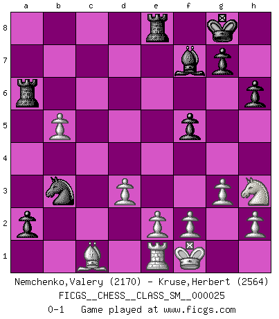 Last move : 0-1 2020 September 2 15:23:41 [Event "FICGS__CHESS__CLASS_SM__000025"] [Site "FICGS"] [Date "2020.05.29"] [Round "1"] [White "Nemchenko,Valery"] [Black "Kruse,Herbert"] [Result "0-1"] [WhiteElo "2170"] [BlackElo "2564"] 1.c4 e5 2.Nc3 Nf6 3.Nf3 Nc6 4.g3 d5 5.cxd5 Nxd5 6.Bg2 Nb6 7.d3 Be7 8.a3 O-O 9.b4 Be6 10.O-O a5 11.b5 Nd4 12.Nd2 c6 13.bxc6 Nxc6 14.Bb2 a4 15.Nb5 Qd7 16.Nc3 Rfd8 17.Nde4 Bb3 18.Qd2 f5 19.Ng5 Nc4 20.Bd5+ Qxd5 21.Nxd5 Nxd2 22.Nxe7+ Nxe7 23.Rfe1 h6 24.Nh3 Bf7 25.Bxe5 Nb3 26.Rab1 Nc6 27.Bc7 Re8 28.Bb6 Ra6 29.Be3 b5 30.Bc1 Ncd4 31.Kf1 b4 32.axb4 a3 33.b5 a2 34.Rxb3 Nxb3 0-1 English Opening Kingside Castling by player Black (move 8) Kingside Castling by player White (move 10) Player Black won this chess game. Follow this game move after move (download)I still hope to kill Fischer. (Boris Spassky) Immer nach dem besten Zug zu suchen ist ziemlich unpraktisch. (Nigel Short) Un buen sacrificio es aquel que aunque no sea necesariamente sólido, deja a tu oponente aturdido y confuso. (Rudolph Spielmann) La victoire dans une partie d'Echecs appartient la plupart du temps à celui qui voit un peu plus loin que l'adversaire. (Lasker) The only thing that overcomes hard luck is hard work. (Harry Golden)