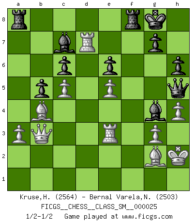 Last move : 1/2-1/2 2020 November 4 14:5:10 [Event "FICGS__CHESS__CLASS_SM__000025"] [Site "FICGS"] [Date "2020.05.29"] [Round "1"] [White "Kruse,Herbert"] [Black "Bernal Varela,Nelson"] [Result "1/2-1/2"] [WhiteElo "2564"] [BlackElo "2503"] 1.d4 e6 2.c4 d5 3.Nc3 c6 4.e3 Nd7 5.Nf3 Ngf6 6.Qc2 Bd6 7.Bd3 dxc4 8.Bxc4 a6 9.O-O O-O 10.Rd1 b5 11.Bd3 Bb7 12.Ng5 h6 13.Nge4 Bb8 14.b4 a5 15.bxa5 Qxa5 16.Bd2 Qc7 17.g3 Ng4 18.Bf1 f5 19.Nc5 Nxc5 20.dxc5 Qe7 21.Ne2 Be5 22.Rac1 Ra6 23.Bb4 Bc8 24.Bg2 Qf7 25.Qb3 Bc7 26.Nd4 Bd7 27.Nf3 Kh7 28.h3 Ne5 29.Nxe5 Bxe5 30.Rd2 Bc7 31.e4 f4 32.e5 Kg8 33.Re1 fxg3 34.fxg3 Be8 35.h4 Qf5 36.Kh2 Bh5 37.a3 Bg4 38.Rd4 Qh5 39.Re3 R6a8 40.Rd7 1/2-1/2 Follow this game move after move (download)In life, as in Chess, one's own Pawns block one's way. A man's very wealth, ease, leisure, children, books, which should help him to win, more often checkmate him. (Charles Buxton) Ich habe Putins Aufstieg an die Macht beobachtet und seine Politik, die demokratischen Institutionen meines Landes zu zerstören. (Garry Kasparov) El Ajedrez expande y enriquece tu mente. (Saudin Robovic) La vie est comme un jeu d'échecs : nous esquissons un plan, mais celui-ci est tributaire de ce que daignent faire l'adversaire aux échecs et le destin dans la vie. (Arthur Schopenhauer) The intuitive mind is a sacred gift; the rational mind is a faithful servant. We have created a society that honors the servant but has forgotten the gift. (Albert Einstein)