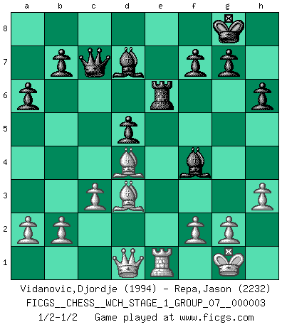 Last move : 1/2-1/2 2007 September 9 0:35:34 [Event "FICGS__CHESS__WCH_STAGE_1_GROUP_07__000003"] [Site "FICGS"] [Date "2007.07.11"] [Round "1"] [White "Vidanovic,Djordje"] [Black "Repa,Jason"] [Result "1/2-1/2"] [WhiteElo "1994"] [BlackElo "2232"] 1.e4 e6 2.d4 d5 3.Nd2 c5 4.Ngf3 Nc6 5.exd5 exd5 6.Bb5 Bd6 7.dxc5 Bxc5 8.O-O Nge7 9.Nb3 Bd6 10.Re1 O-O 11.Bd2 a6 12.Bd3 h6 13.Nbd4 Re8 14.c3 Qc7 15.h3 Bd7 16.Be3 Nxd4 17.Nxd4 Nc6 18.Nf3 Ne5 19.Nxe5 Rxe5 20.Qd2 Rae8 21.Bd4 R5e6 22.Rxe6 Rxe6 23.Re1 Bf4 24.Qd1 Be5 25.Be3 Bf4 26.Bd4 Be5 27.Be3 Bf4 28.Bd4 1/2-1/2 French : Tarrasch, Open variation Kingside Castling by player White (move 8) Kingside Castling by player Black (move 10) This chess game ended in a draw. Follow this game move after move (download)In Chess, as it is played by masters, chance is practically eliminated. (Emanuel Lasker) Die Elozahlen sind sehr schlecht für das Schach. Jetzt ist Schach eine Sportindustrie, die darauf zielt Elopunkte zu machen. (Miguel Najdorf) En la perfecta combinación de Ajedrez como en una historia corta de primera clase, toda la trama y contra trama deberá conducir hacia un final sorprendente, el interes no es mitigado hasta el último momento. (Yates and Winter) Toutes choses étant égales, c'est la conviction qui gagne. Alliée à une volonté de vaincre, elle sert de détonateur, suscite des idées, disperse les doutes et aide à penser clairement. (Robert Fischer) Knowledge rests not upon truth alone, but upon error also. (Carl G. Jung)