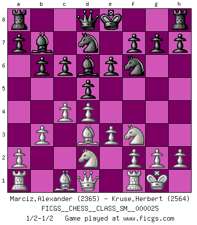 Last move : 1/2-1/2 2020 June 29 10:47:4 [Event "FICGS__CHESS__CLASS_SM__000025"] [Site "FICGS"] [Date "2020.05.29"] [Round "1"] [White "Marciz,Alexander"] [Black "Kruse,Herbert"] [Result "1/2-1/2"] [WhiteElo "2365"] [BlackElo "2564"] 1.d4 Nf6 2.c4 c6 3.Nf3 d5 4.e3 e6 5.Bd3 b6 6.O-O Bb7 7.Nbd2 Nbd7 8.b3 Bd6 1/2-1/2 Queen's pawn game Kingside Castling by player White (move 6) This chess game ended in a draw. Follow this game move after move (download)All I want to do, ever, is just play Chess. (Bobby Fischer) Capablanka war das größte Genie der Schachgeschichte! Aber denken sie nicht er habe nichts vom Schach verstanden. Er wusste nur soviel wie er wissen musste um seine Ziele zu erreichen. (Mikhail Moiseyevich Botvinik) ¿Cual es el objetivo de jugar una apertura de gambito?... Para adquirir una reputación de ser un jugador apuesto a costo de perder el juego. (Siegbert Tarrasch) L'action d'une oeuvre littéraire se déroule sur un champ de bataille. Les masques et les types du drame moderne correspondent aux pièces du jeu d'échecs. L'intrigue correspond aux coups et aux gambits, c'est à dire aux techniques du jeu telles qu'utilisées et interprétées par les joueurs. Les tactiques et les péripéties [mouvements] correspondent aux coups exécutés par l'adversaire. (Viktor Shklovsky) Quotation,n.: The act of repeating erroneously the words of another. The words erroneously repeated. (Ambrose Bierce, The Devil's Dictionary)