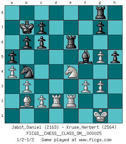 Last move : 1/2-1/2 2020 December 27 18:45:22 [Event "FICGS__CHESS__CLASS_SM__000025"] [Site "FICGS"] [Date "2020.05.29"] [Round "1"] [White "Jabot,Daniel"] [Black "Kruse,Herbert"] [Result "1/2-1/2"] [WhiteElo "2163"] [BlackElo "2564"] 1.e4 e5 2.Nf3 Nc6 3.Bb5 Nf6 4.O-O Nxe4 5.d4 Nd6 6.Bxc6 dxc6 7.dxe5 Nf5 8.Qxd8+ Kxd8 9.Nc3 Bd7 10.Rd1 Kc8 11.a4 a5 12.h3 b6 13.b3 h5 14.Rd3 Ne7 15.Bb2 Bf5 16.Rd2 Ng6 17.Nd4 Bd7 18.Re1 Kb7 19.Nf3 Bf5 20.Nd4 Bd7 21.e6 Re8 22.Rde2 fxe6 23.Nxe6 Bb4 24.g3 Rhg8 25.Ng5 Ne7 26.Rd1 Bf5 27.Nce4 Nd5 28.f3 Be7 29.R1d2 Nb4 30.h4 Bxg5 31.hxg5 Re6 1/2-1/2 Follow this game move after move (download)We must make sure that Chess will not be like a dead language, very interesting, but for a very small group. (Sytze Faber) Frage: Was machen Sie mit den Preisen? Anwort: Ich habe Angst, dass meine Freundin davon neue Kleider kauft. (Loek van Wely) El Ajedrez es despiadado: debes de estar preparado para matar gente. (Nigel Short) Mais n'est-ce pas déjà le limiter injurieusement que d'appeler les échecs un jeu? N'est-ce pas aussi une science, un art, ou quelque chose qui, comme le cercueil de Mahomet entre ciel et terre, est suspendu entre l'un et l'autre, et qui réunit un nombre incroyable de contraires ? (Stefan Zweig) The bottom line is always the bottom line. (Johann Piek)