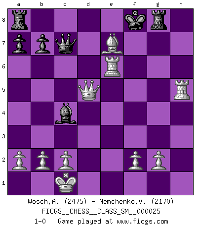 Last move : 1-0 2020 October 11 8:42:37 [Event "FICGS__CHESS__CLASS_SM__000025"] [Site "FICGS"] [Date "2020.05.29"] [Round "1"] [White "Wosch,Arkadiusz"] [Black "Nemchenko,Valery"] [Result "1-0"] [WhiteElo "2475"] [BlackElo "2170"] 1.e4 c6 2.d4 g6 3.Nc3 d5 4.e5 Bg7 5.Bf4 f6 6.Qd2 Nd7 7.Nf3 fxe5 8.dxe5 Nc5 9.h4 Qb6 10.O-O-O Qa5 11.Be3 Nd7 12.h5 Nxe5 13.Nxe5 Bxe5 14.Bd4 Qc7 15.Re1 Bf6 16.hxg6 e6 17.Nxd5 cxd5 18.Bb5+ Kd8 19.Rh5 Bd7 20.gxh7 Bxb5 21.hxg8Q+ Rxg8 22.Bxf6+ Ke8 23.Qxd5 Bc4 24.Rxe6+ Kf8 25.Be7+ 1-0 Caro-Kann defense Queenside Castling by player White (move 10) Promotion Queen by player White (move 21) Player White won this chess game. Follow this game move after move (download)A man that will take back a move at Chess will pick a pocket. (Richard Fenton) Die Leute spielen gegen mich seit 15 Jahren unter Ihren Möglichkeiten. (Robert James Fischer) Si no le temes a Spassky, entonces elimino el elemento del dinero. (Jim Slater) Même si vous avez un bon coup à faire, regardez toujours s'il n'y en a pas un qui lui soit préférable. (Pedro Damiano) He who laughs last probably does not get the joke. (Unknown)