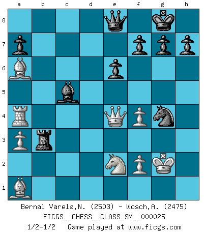 Last move : 1/2-1/2 2020 December 17 20:8:35 [Event "FICGS__CHESS__CLASS_SM__000025"] [Site "FICGS"] [Date "2020.05.29"] [Round "1"] [White "Bernal Varela,Nelson"] [Black "Wosch,Arkadiusz"] [Result "1/2-1/2"] [WhiteElo "2503"] [BlackElo "2475"] 1.d4 Nf6 2.c4 e6 3.Nf3 d5 4.Nc3 c6 5.e3 Nbd7 6.Qc2 Bd6 7.Bd3 O-O 8.O-O dxc4 9.Bxc4 b5 10.Bd3 Bb7 11.a3 Rc8 12.Rd1 c5 13.Bxb5 Bxf3 14.gxf3 cxd4 15.Rxd4 Nd5 16.f4 N7f6 17.Qd3 Bc5 18.Ra4 Rb8 19.Ne2 Qc7 20.Ba6 Qc6 21.b3 Ng4 22.h3 Rfd8 23.hxg4 Nxe3 24.Qe4 Rd1+ 25.Kh2 Nxg4+ 26.Kg2 Qe8 27.Qc2 Qc6+ 28.Qe4 Qe8 29.Bb2 Rxa1 30.Bxa1 Rxb3 31.Qc4 Qc6+ 32.Qe4 Qe8 33.Qc4 Qc6+ 34.Qe4 Qe8 1/2-1/2 Follow this game move after move (download)Avoid the crowd. Do your own thinking independently. Be the Chess player, not the Chess piece. (Ralph Charell) Modernes Schach erfordert enorme Anspannung. Es ist für einen normalen Menschen unmöglich das auszuhalten. (Viktor Kortschnoi) Un sacrificio se refuta mucho mejor al aceptarlo. (Wilhelm Steinitz) Les écrivains ont utilisé les échecs pour analyser les côtés extrêmes de la nature humaine. Dans ce cadre, les échecs offrent un champ d'expérimentation idéal. Mais on pourrait faire la même chose avec la peinture. Et là, en vous référant à Van Gogh, vous ne tirerez pas de conclusion définitive sur les peintres. (Gary Kasparov) Chess, like love, like music, has the power to make people happy. (Siegbert Tarrasch)