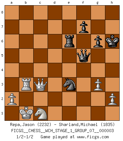 Last move : 1/2-1/2 2007 November 8 9:50:57 [Event "FICGS__CHESS__WCH_STAGE_1_GROUP_07__000003"] [Site "FICGS"] [Date "2007.07.11"] [Round "1"] [White "Repa,Jason"] [Black "Sharland,Michael"] [Result "1/2-1/2"] [WhiteElo "2232"] [BlackElo "1835"] 1.e4 c5 2.Nf3 d6 3.d4 cxd4 4.Nxd4 Nf6 5.Nc3 a6 6.Be3 e5 7.Nb3 Be6 8.f3 h5 9.Qd2 Be7 10.O-O-O Nbd7 11.Kb1 b5 12.f4 Qc7 13.Nd5 Bxd5 14.exd5 O-O 15.fxe5 Nxe5 16.Bd4 Rac8 17.c3 Qb7 18.g3 Qxd5 19.Bg2 Qe6 20.Rhe1 b4 21.Qe2 bxc3 22.Bxc3 Rxc3 23.bxc3 Qc8 24.c4 Re8 25.c5 Bf8 26.cxd6 Bxd6 27.Rc1 Qf5+ 28.Qc2 Qg4 29.Re3 Qb4 30.Qc3 Qb6 31.Re2 Ba3 32.Qc7 Qe6 33.R1c2 Qf5 34.Qa5 Bf8 35.Bb7 Qf1+ 36.Re1 Qf5 37.Bxa6 g6 38.Rf1 Qe6 39.Re2 Bg7 40.Rc1 Nd5 41.Rc5 Qf5+ 42.R5c2 Qf3 43.Bb7 Nc3+ 44.Qxc3 Qxb7 45.Qd2 Kh7 46.Rc5 Qf3 47.Qe3 Qh1+ 48.Qc1 Qf3 49.Re3 Qf5+ 50.Qc2 Qf1+ 51.Nc1 Nc4 52.Rb3 Ne3 53.Rxh5+ Bh6 54.Qc6 Re6 55.Rxh6+ Kxh6 56.Qc3 Qf5+ 1/2-1/2 Sicilian : Najdorf, Byrne (English) attack Queenside Castling by player White (move 10) Kingside Castling by player Black (move 14) This chess game ended in a draw. Follow this game move after move (download)Chess is a sea in which a gnat may drink and an elephant may bathe. (Hindu proverb) Über Frauen: Chess is better. (Robert James Fischer) Personalmente, yo prefiero mirar hacia el futuro en donde un programa de computadora gane el título mundial de Ajedrez. La humanidad necesita una lección de humildad. (Richard Dawkings) Je ne crois pas en la psychologie, je crois aux bons coups. (Robert Fischer) Control your own destiny or someone else will. (Jack Welch)