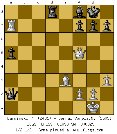 Last move : 1/2-1/2 2020 July 19 9:34:14 [Event "FICGS__CHESS__CLASS_SM__000025"] [Site "FICGS"] [Date "2020.05.29"] [Round "1"] [White "Larwinski,Paul"] [Black "Bernal Varela,Nelson"] [Result "1/2-1/2"] [WhiteElo "2431"] [BlackElo "2503"] 1.d4 e6 2.c4 d5 3.Nc3 c6 4.cxd5 exd5 5.Bf4 Nf6 6.e3 Bf5 7.Nge2 Nh5 8.Be5 Nd7 9.h3 Nhf6 10.Bf4 Qb6 11.Qd2 Ne4 12.Nxe4 Bxe4 13.Nc3 Bg6 14.Bd3 Be7 15.O-O O-O 16.Rfe1 Rfe8 17.e4 dxe4 18.Bxe4 Bxe4 19.Rxe4 Nf6 20.Re5 Rad8 21.d5 Nxd5 22.Nxd5 Rxd5 23.Rxd5 cxd5 24.Qxd5 Rd8 25.Qf5 Qxb2 26.Rb1 Qxa2 27.Rxb7 Bf8 28.Be3 a5 29.Ra7 1/2-1/2 Queen's pawn Kingside Castling by player White (move 15) Kingside Castling by player Black (move 15) This chess game ended in a draw. Follow this game move after move (download)After black's reply to 1.e4 with 1..e5, leaves him always trying to get into the game. (Howard Staunton) Habe Mut, dich deines eigenen Verstandes zu bedienen. (Immanuel Kant) Coloca el contenido de las piezas del Ajedrez en un sombrero, agitalo vigorosamente, arrojalas en un tablero desde una altura de 30 centimetros y así obtendras el estilo de Steinitz. (H. E. Bird) On entre au jeu d'Echecs comme on entre en Religion. Pour le joueur d'Echecs, la partie d'Echecs c'est l'office, la messe, le défilé du 1er Mai, le dépôt de gerbe au Monument aux Morts. C'est un drame sacré. (Michel Roos) Optimism is a variety of information deficit. Sometimes especially true for correspondence chess games. (Michael Aigner)