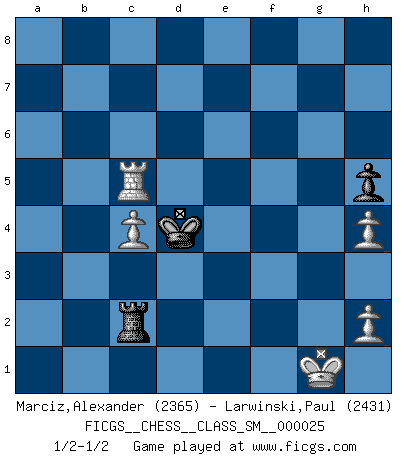 Last move : 1/2-1/2 2020 July 2 15:16:7 [Event "FICGS__CHESS__CLASS_SM__000025"] [Site "FICGS"] [Date "2020.05.29"] [Round "1"] [White "Marciz,Alexander"] [Black "Larwinski,Paul"] [Result "1/2-1/2"] [WhiteElo "2365"] [BlackElo "2431"] 1.d4 d5 2.c4 dxc4 3.e4 e5 4.Nf3 exd4 5.Bxc4 Nc6 6.O-O Be6 7.Bxe6 fxe6 8.Qb3 Qd7 9.Qxb7 Rb8 10.Qa6 Nf6 11.Nbd2 Bd6 12.b3 O-O 13.Ba3 Nh5 14.g3 Nf6 15.Kg2 e5 16.Rac1 Ne7 17.Bc5 Ng6 18.Ng1 Qc8 19.Qe2 Qd8 20.Ngf3 a5 21.Ne1 Nd7 22.Nd3 Qg5 23.Kh1 Rbd8 24.Bxd6 cxd6 25.Nc4 Nf6 26.f3 d5 27.Nxa5 Qh5 28.Rf2 dxe4 29.fxe4 Ng4 30.R2f1 Qh3 31.Kg1 Rxf1+ 32.Rxf1 Ne3 33.Re1 Ra8 34.Nc4 Nxc4 35.bxc4 h6 36.Qb2 Nh4 37.Nxe5 Qe6 38.gxh4 Qxe5 39.Qb5 Qf4 40.Qd5+ Kh7 41.Qf5+ Qxf5 42.exf5 Rxa2 43.Rd1 Rc2 44.Rxd4 Kg8 45.Rd8+ Kf7 46.Rc8 Kf6 47.Rc5 Rd2 48.Rc7 Kxf5 49.Rxg7 Rc2 50.Rc7 Ke4 51.Rc6 h5 52.Rc5 Kd4 1/2-1/2 QGA : 3.e4 Kingside Castling by player White (move 6) Kingside Castling by player Black (move 12) 10 pieces endgame at move 44 : White KRPPPP , Black KRPP WHITE : King + 1 Rook 4 Pawns BLACK : King + 1 Rook 2 Pawns 9 pieces endgame at move 48 : White KRPPP , Black KRPP WHITE : King + 1 Rook 3 Pawns BLACK : King + 1 Rook 2 Pawns 8 pieces endgame at move 49 : White KRPPP , Black KRP WHITE : King + 1 Rook 3 Pawns BLACK : King + 1 Rook 1 Pawn This chess game ended in a draw. Follow this game move after move (download)Daring ideas are like Chess men moved forward. They may be beaten, but they may start a winning game. (Johann Wolfgang von Goethe) Schach ist Krieg, im Schach geht es um testosterongesteuerte Urschreie. (Garry Kasparov) ¿Cual es el objetivo de jugar una apertura de gambito?... Para adquirir una reputación de ser un jugador apuesto a costo de perder el juego. (Siegbert Tarrasch) Les Echecs ne sont pas pour les âmes timides. Ils requièrent un homme entier, qui ne s'arrête pas aveuglément à ce qui a été déjà établi, mais qui tente individuellement de sonder les profondeurs du jeu. (W. Steinitz) You cannot beat a roulette table unless you steal money from it. (Albert Einstein)