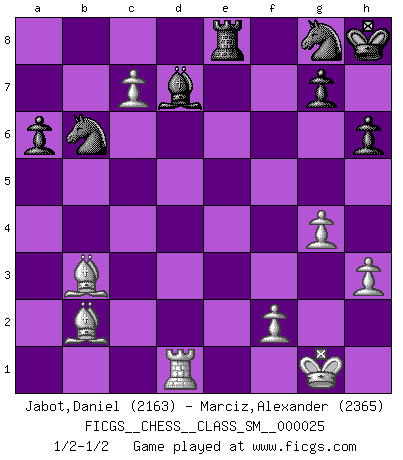 Last move : 1/2-1/2 2021 February 11 4:24:24 [Event "FICGS__CHESS__CLASS_SM__000025"] [Site "FICGS"] [Date "2020.05.29"] [Round "1"] [White "Jabot,Daniel"] [Black "Marciz,Alexander"] [Result "1/2-1/2"] [WhiteElo "2163"] [BlackElo "2365"] 1.e4 e5 2.Nf3 Nc6 3.Bb5 Nge7 4.O-O a6 5.Bc4 Ng6 6.d4 h6 7.c3 Be7 8.a4 d6 9.a5 Bg5 10.d5 Nb8 11.Nbd2 O-O 12.Nxg5 Qxg5 13.Nf3 Qd8 14.Ra3 f5 15.Bd3 Ne7 16.Nd2 Nd7 17.exf5 Nc5 18.Be2 Bxf5 19.c4 Bh7 20.h3 Nd7 21.b4 Qe8 22.Bg4 Bf5 23.Be2 Bh7 24.Bb2 Rd8 25.Bg4 Ng6 26.g3 Nf6 27.Bf3 Qd7 28.Bg2 Rde8 29.Qa4 Qf7 30.Qd1 Ne7 31.Rb3 Nf5 32.Nf3 Rc8 33.Ra3 Rce8 34.Qa1 Qd7 35.Qd1 Ne7 36.Re3 b5 37.axb6 cxb6 38.Nxe5 dxe5 39.Rxe5 Nf5 40.Rxe8 Rxe8 41.c5 bxc5 42.bxc5 Qb5 43.Qc1 Rc8 44.c6 Nxd5 45.Qd2 Nfe7 46.Qd4 Nf6 47.Re1 Re8 48.Re6 Qf5 49.Qc4 Qc2 50.Bf1 Kh8 51.c7 Qxc4 52.Bxc4 Bf5 53.Re5 Nfg8 54.g4 Bd7 55.Re1 Nc8 56.Rd1 Nb6 57.Bb3 1/2-1/2 Follow this game move after move (download)In Chess, as it is played by masters, chance is practically eliminated. (Emanuel Lasker) Er war ein guter Schachspieler, aber ich kann Leute nicht ausstehen, die 'Heil Hitler' rufen (Über Alexander Aljechin). (Miguel Najdorf) El Ajedrez es 99 por ciento táctica. (Teichmann) Votre prénom est 'Tactique', votre deuxième prénom est 'Tactique' et votre nom est 'Tactique'. (Ken Smith) We're missing something. (Gregory House, House M.D.)
