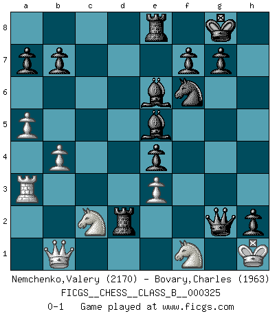 Last move : 0-1 2020 August 25 19:56:55 [Event "FICGS__CHESS__CLASS_B__000325"] [Site "FICGS"] [Date "2020.05.31"] [Round "1"] [White "Nemchenko,Valery"] [Black "Bovary,Charles"] [Result "0-1"] [WhiteElo "2170"] [BlackElo "1963"] 1.Nf3 d5 2.g3 c5 3.d4 cxd4 4.Nxd4 e5 5.Nb3 Nf6 6.Bg2 Bb4+ 7.c3 Be7 8.Bg5 Nbd7 9.O-O O-O 10.Qc2 h6 11.Bxf6 Nxf6 12.N1d2 e4 13.Rfd1 Qc7 14.Nf1 Be6 15.Nd4 Rac8 16.a4 Rfe8 17.a5 Bd7 18.Ne3 Bc5 19.Qb3 Qe5 20.Qa2 h5 21.Nf1 h4 22.b3 Qh5 23.f3 Qg6 24.b4 Bd6 25.e3 Rxc3 26.fxe4 dxe4 27.Nc2 Be5 28.Nd2 hxg3 29.Nf1 Be6 30.Qb1 gxh2+ 31.Kh1 Rd3 32.Rd2 Rxd2 33.Ra3 Qxg2+ 0-1 Reti : King's Indian attack (with ...c5) Kingside Castling by player White (move 9) Kingside Castling by player Black (move 9) Player Black won this chess game. Follow this game move after move (download)Bobby is the finest Chess player this country ever produced. His memory for the moves, his brilliance in dreaming up combinations, and his fierce determination to win are uncanny. (John Collins) Schon mancher Spieler hat aufgegeben, um zu vermeiden, daß er eine Figur verliert. (Savielly Grigorievitsch Tartakower) El Ajedrez se juega con la mente... ¡no con las manos!. (Renaud y Kahn) La conception d'un plan est le processus par lequel un joueur exploite les avantages de sa position tout en s'efforçant d'en réduire au minimum les inconvénients. Afin de garantir le succès, un plan doit toujours se fonder sur un diagnostic objectif des particularités d'une position. La conception d'un plan est d'autant plus difficile que la position est équilibrée, et grandement facilitée lorsqu'il n'existe qu'un seul plan susceptible de répondre aux exigences de la position. (Harry Golombek) Don't anthropomorphize computers - they hate it. (Anonymous)