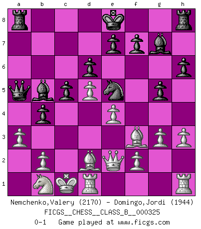 Last move : 0-1 2020 September 3 9:36:12 [Event "FICGS__CHESS__CLASS_B__000325"] [Site "FICGS"] [Date "2020.05.31"] [Round "1"] [White "Nemchenko,Valery"] [Black "Domingo,Jordi"] [Result "0-1"] [WhiteElo "2170"] [BlackElo "1944"] 1.Nf3 h6 2.c4 g5 3.h3 Bg7 4.d4 c5 5.d5 d6 6.e4 Nd7 7.Be2 Nf8 8.Qd3 Ng6 9.Nc3 Nf6 10.Qc2 Nd7 11.Be3 Nde5 12.O-O-O Nxf3 13.Bxf3 a6 14.g3 b5 15.cxb5 axb5 16.a3 Qa5 17.Qb3 b4 18.Nb1 Bd7 19.Bd2 Ba4 20.Qd3 Ne5 21.Qe2 Bb5 0-1 Reti Opening Queenside Castling by player White (move 12) Player Black won this chess game. Follow this game move after move (download)Chess is mental torture. (Garry Kasparov) Wir können eben der zündenden Macht des Opfers nicht wiederstehen, denn die Begeisterung für das Opfer liegt in der Natur des Menschen. (Rudolf Spielmann) Me gusta decir que Bobby Fischer fue el mejor jugador que jamás haya existido. Pero lo que hizo de Fischer un genio, fue su habilidad de mezclar una frescura y pragmatismo Americano con ideas Rusas acerca de la estrategia. (Bruce Pandolfini) Les écrivains ont utilisé les échecs pour analyser les côtés extrêmes de la nature humaine. Dans ce cadre, les échecs offrent un champ d'expérimentation idéal. Mais on pourrait faire la même chose avec la peinture. Et là, en vous référant à Van Gogh, vous ne tirerez pas de conclusion définitive sur les peintres. (Gary Kasparov) It is not enough to be a good player... you must also play well. (Siegbert Tarrasch)