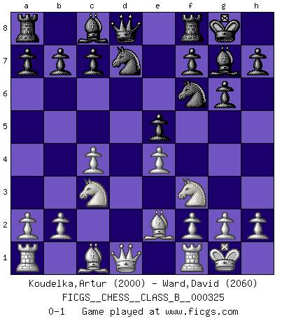 Last move : 0-1 2020 July 14 21:16:3 [Event "FICGS__CHESS__CLASS_B__000325"] [Site "FICGS"] [Date "2020.05.31"] [Round "1"] [White "Koudelka,Artur"] [Black "Ward,David"] [Result "0-1"] [WhiteElo "2000"] [BlackElo "2060"] 1.d4 Nf6 2.c4 g6 3.Nc3 Bg7 4.e4 d6 5.Nf3 O-O 6.Be2 Nbd7 7.O-O e5 8.dxe5 dxe5 0-1 This chess game has been lost on time (started : 2020.05.31 15:37:23) King's Indian : 6.Be2 Kingside Castling by player Black (move 5) Kingside Castling by player White (move 7) Player Black won this chess game. Follow this game move after move (download)The combination player thinks forward; he starts from the given position, and tries the forceful moves in his mind. (Emanuel Lasker) Offener Brief an US-Präsident Bush anlässlich der Verhaftung Bobby Fishers: Verhaften Sie mich. Stecken Sie mich in dieselbe Zelle wie Bobby Fisher und geben Sie uns ein Schachspiel mit. (Boris Vassilievich Spassky) Aún deseo matar a Fischer. (Boris Spassky) Toutes les manuvres exécutées sur une colonne ouverte ont pour but ultime l'intrusion définitive sur la septième ou la huitième rangée, en plein cur de la position ennemie. (Aaron Nimzovitch) A good player is always lucky. (Capablanca)