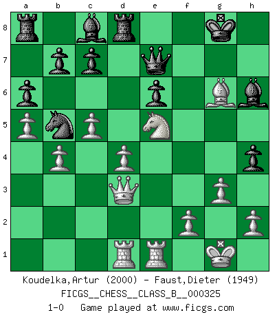 Last move : 1-0 2020 November 8 15:21:5 [Event "FICGS__CHESS__CLASS_B__000325"] [Site "FICGS"] [Date "2020.05.31"] [Round "1"] [White "Koudelka,Artur"] [Black "Faust,Dieter"] [Result "1-0"] [WhiteElo "2000"] [BlackElo "1949"] 1.e4 a6 2.d4 d5 3.exd5 Qxd5 4.Nf3 Nf6 5.Be2 e6 6.c4 Qd8 7.O-O Nc6 8.Nc3 Bd6 9.Re1 O-O 10.Bd3 Re8 11.Bg5 h6 12.Bxf6 Qxf6 13.Bc2 Bd7 14.Ne4 Qd8 15.a3 Bf8 16.Qd2 g6 17.b4 Bg7 18.Rad1 Ne7 19.Ne5 Nf5 20.Nc5 Bc8 21.Qc3 Nd6 22.g3 Qf6 23.a4 Rd8 24.a5 Qe7 25.Ncd3 h5 26.Nf4 Bh6 27.Nfxg6 fxg6 28.Bxg6 h4 29.c5 Nb5 30.Qd3 1-0 Follow this game move after move (download)Checkers is for tramps. (Paul Morphy) Ohne ihre Erfolge schmälern zu wollen würde ich sagen Petrosian, Spassky und Karpov verdanken ihre Siege ihren Trainern - Boleslavsky, Bondarevsky und Furman. (Mikhail Moiseyevich Botvinik) Peones: ellos son el alma de esta partida, solos forman el ataque y la defensa. (Philidor) Un footballeur joue avec ses pieds, parfois avec sa tête. Un joueur d'échecs ne joue qu'avec sa tête. Et quand il ne joue plus, il meurt. (Jacob Murray) You have to believe in yourself. (Sun Tzu)