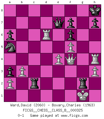 Last move : 0-1 2020 November 12 7:38:23 [Event "FICGS__CHESS__CLASS_B__000325"] [Site "FICGS"] [Date "2020.05.31"] [Round "1"] [White "Ward,David"] [Black "Bovary,Charles"] [Result "0-1"] [WhiteElo "2060"] [BlackElo "1963"] 1.e4 e5 2.Nf3 Nc6 3.Bb5 a6 4.Ba4 Nf6 5.Nc3 Bc5 6.O-O O-O 7.d3 d6 8.h3 b5 9.Bb3 Na5 10.Bg5 c6 11.d4 Bxd4 12.Nxd4 exd4 13.Qxd4 c5 14.Bxf6 gxf6 15.Qd5 Bb7 16.Qh5 c4 17.f4 Rc8 18.f5 Kh8 19.Ba4 Rg8 20.Qh6 bxa4 21.Rad1 Bc6 22.Rf4 Qe7 23.Rh4 Rg7 24.Qf4 a3 25.b3 cxb3 26.cxb3 Bb7 27.Nd5 Bxd5 28.Rxd5 Rc2 29.Rxd6 R7xg2+ 0-1 Follow this game move after move (download)Becoming successful at Chess allows you to discover your own personality. That's what I want for the kids I teach. (Saudin Robovic) Die unerbitterlichsten Regeln im Schach sind die Ausnahmen. (Savielly Grigorievitsch Tartakower) Nada excita más a Grandes Maestros aburridos que una novedad teórica. (Dominic Lawson) Dans le domaine de la peinture, de la gravure et de la sculpture, dès la première décennie de notre siècle, les artistes abandonnent la représentation de la partie d'échecs pour se concentrer sur les pièces, sur les échiquiers et sur toutes les variations auxquelles les unes et les autres peuvent donner lieu. On passe en quelque sorte d'un thème social à un thème musical (au sens de la musica médiévale, c'est-à-dire d'une notion qui inclue le rythme, l'harmonie, la construction et la déconstruction, etc.). Graphiquement et picturalement, l'échiquier apparaît comme une structure ouverte, dynamique, d'une richesse infinie, autorisant toutes les combinatoires et débouchant sur des mouvements et des rythmes de nature exponentielle. (Michel Pastoureau) Mac users swear by their computers. PC users swear at their computers. (Author unknown)