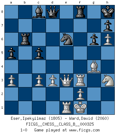 Last move : 1-0 2021 March 18 16:4:24 [Event "FICGS__CHESS__CLASS_B__000325"] [Site "FICGS"] [Date "2020.05.31"] [Round "1"] [White "Eser,Ipekyilmaz"] [Black "Ward,David"] [Result "1-0"] [WhiteElo "1805"] [BlackElo "2060"] 1.a3 f5 2.g3 e5 3.Bg2 Nf6 4.d3 d6 5.Bg5 Be7 6.Bxf6 Bxf6 7.Nd2 O-O 8.h3 c6 9.h4 Na6 10.h5 Nc5 11.h6 g6 12.e3 f4 13.Qe2 a5 14.Bh3 Ne6 15.gxf4 exf4 16.c3 Kh8 17.e4 f3 18.Ndxf3 Nf4 19.Qd2 b5 20.Kf1 Ne6 21.Re1 Qe7 22.Bg4 c5 23.Rh3 b4 24.Rg3 bxc3 25.bxc3 Rb8 26.Nh3 Rb3 27.e5 Bxe5 28.Nxe5 dxe5 29.Rxe5 Qf6 30.Re1 Rb6 31.Rf3 Qd8 32.Qe3 1-0 Follow this game move after move (download)If one piece is badly posted, the whole game is bad. (Tarrasch) Ja, jede Frau in Holland liebt mich bestimmt, und alle Männer hassen mich. (Loek van Wely) Solo existe una cosa que Fischer hace en el Ajedrez sin placer: ¡perder!. (Boris Spassky) Les échecs sont plus proches de l'art de l'assassinat que de l'art de la guerre. (Arturo Perez-Reverte) Programming can only do so much before it becomes too much. (Don Groves)