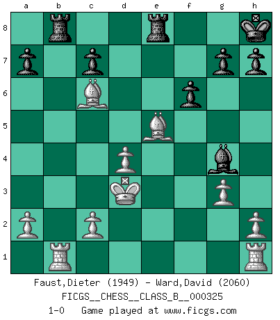 Last move : 1-0 2020 August 10 23:14:31 [Event "FICGS__CHESS__CLASS_B__000325"] [Site "FICGS"] [Date "2020.05.31"] [Round "1"] [White "Faust,Dieter"] [Black "Ward,David"] [Result "1-0"] [WhiteElo "1949"] [BlackElo "2060"] 1.e4 e5 2.Nc3 Nf6 3.f4 d5 4.fxe5 Nxe4 5.d3 Nxc3 6.bxc3 d4 7.Rb1 Nc6 8.Nf3 Bc5 9.cxd4 Bxd4 10.Nxd4 Qh4+ 11.g3 Qxd4 12.Bg2 Nxe5 13.Bb2 Qe3+ 14.Qe2 Qxe2+ 15.Kxe2 O-O 16.Bxe5 Re8 17.d4 f6 18.Bd5+ Kh8 19.Bxb7 Rb8 20.Bc6 Bg4+ 21.Kd3 1-0 Vienna gambit Kingside Castling by player Black (move 15) Player White won this chess game. Follow this game move after move (download)The sign of a great Master is his ability to win a won game quickly and painlessly. (Irving Chernev) Modernes Schach erfordert enorme Anspannung. Es ist für einen normalen Menschen unmöglich das auszuhalten. (Viktor Kortschnoi) Me dio la sensación de como si yo estuviera jugando en contra del mismo Ajedrez. - al estar jugando en contra de Robert Fischer (Walter Shipman) Je crois qu'il existe des manières très spécifiques de jouer efficacement contre une machine. Evidemment, nous n'avons aucune chance en technique pure, parce que l'ordinateur calcule de manière parfaite. Mais lorsque nous faisons appel à notre cerveau, en utilisant l'intuition et la compréhension, alors nous restons beaucoup plus forts. (Anatoli Karpov) Question: Is 'This statement is paradoxical' a paradoxical statement ? Or is it a meta-paradox ? (Normajean Yates)