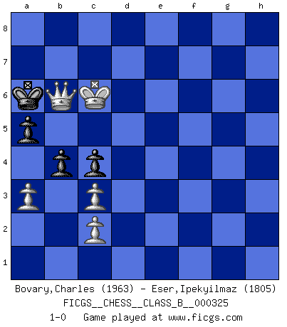 Last move : 1-0 2021 April 18 9:36:26 [Event "FICGS__CHESS__CLASS_B__000325"] [Site "FICGS"] [Date "2020.05.31"] [Round "1"] [White "Bovary,Charles"] [Black "Eser,Ipekyilmaz"] [Result "1-0"] [WhiteElo "1963"] [BlackElo "1805"] 1.d4 f6 2.e4 e6 3.Nc3 Bb4 4.a3 Bxc3+ 5.bxc3 b6 6.Bd3 Bb7 7.Nf3 a6 8.O-O h6 9.Nh4 Ne7 10.Qg4 Kf8 11.f4 h5 12.Qg3 d6 13.Bb2 Nd7 14.e5 Kg8 15.f5 dxe5 16.fxe6 e4 17.Bc4 Nf8 18.Rxf6 Qd6 19.Rf7 Qxg3 20.hxg3 Re8 21.Raf1 Kh7 22.Nf5 Nxf5 23.R7xf5 Kg6 24.d5 Bc8 25.Bc1 Nh7 26.Be2 Nf6 27.Rg5+ Kh7 28.Bxh5 Nxh5 29.Rxh5+ Kg8 30.Re5 b5 31.Rf7 c6 32.d6 Rxe6 33.Ref5 Kh7 34.d7 Kg6 35.dxc8Q Rxc8 36.Be3 Rce8 37.g4 R8e7 38.Rxe7 Rxe7 39.Kf2 Rd7 40.Re5 Kf7 41.Rxe4 Rc7 42.Bc5 Kf6 43.g5+ Kxg5 44.Kg3 Kg6 45.Re7 Rxe7 46.Bxe7 Kf5 47.Kf3 Ke6 48.Bc5 Kd5 49.Bd4 g6 50.Kf4 c5 51.Ke3 Kc4 52.Ke4 g5 53.Bf6 g4 54.Kf4 Kd5 55.Kxg4 Ke4 56.Kh5 Kf5 57.Be7 c4 58.g4+ Ke6 59.g5 Kxe7 60.Kh6 Kf7 61.Kh7 Kf8 62.g6 Ke7 63.g7 Kd6 64.g8Q Kc6 65.Qd8 Kc5 66.Kg6 Kc6 67.Kf6 Kb7 68.Ke6 Kc6 69.Qc8+ Kb6 70.Kd6 a5 71.Qc7+ Ka6 72.Kc6 b4 73.Qb6+ 1-0 Follow this game move after move (download)There are two classes of men; those who are content to yield to circumstances and who play whist; those who aim to control circumstances, and who play Chess. (Mortimer Collins) Du musst nicht gut spielen, es reicht, wenn du besser spielst als dein Gegner. (Anonymous) Vive, pierde y aprende al observar a tu oponente como gana. (Amber Steenbock) Ce n'est pas pour s'amuser qu'il joue aux échecs : il célèbre un culte. (Vladimir Nabokov) Horse racing is animated roulette. (Roger Kahn)