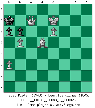 Last move : 1-0 2021 March 15 8:59:43 [Event "FICGS__CHESS__CLASS_B__000325"] [Site "FICGS"] [Date "2020.05.31"] [Round "1"] [White "Faust,Dieter"] [Black "Eser,Ipekyilmaz"] [Result "1-0"] [WhiteElo "1949"] [BlackElo "1805"] 1.Nf3 f6 2.e4 e6 3.d4 f5 4.exf5 exf5 5.Bd3 g6 6.O-O Bg7 7.Re1+ Kf8 8.Nc3 Nf6 9.h4 d6 10.Ne2 Nc6 11.Nf4 Nb4 12.Bc4 d5 13.Bb3 c6 14.h5 Ne4 15.hxg6 Kg8 16.g3 hxg6 17.Nxg6 Rh7 18.Nfh4 Bf6 19.Kg2 Be6 20.Qf3 Bxd4 21.Nxf5 Bxf5 22.Qxf5 Qf6 23.Qxf6 Nxf6 24.Re2 Bb6 25.a3 Na6 26.c4 Nc5 27.Bc2 Re8 28.Rxe8+ Nxe8 29.cxd5 cxd5 30.Nf4 Rd7 31.b4 Ne4 32.Nxd5 Rxd5 33.Bxe4 Rd7 34.Bf3 Bd4 35.Ra2 Bf6 36.g4 b6 37.g5 Rc7 38.Bf4 Rg7 39.Re2 Be7 40.Re5 Kf8 41.Bh5 Nf6 42.Rf5 Kg8 43.Be2 Ne4 44.Bc4+ Kh8 45.Be5 Nd6 46.Bxg7+ Kxg7 47.Re5 Bf8 48.Bb3 Nb7 49.f4 Bd6 50.Kf3 Bxe5 51.fxe5 Nd8 52.Bd5 Kf8 53.Kf4 Kg7 54.b5 Kf8 55.g6 Kg7 56.Kf5 Kf8 57.Kf6 Ke8 58.g7 Kd7 59.g8Q a6 60.e6+ Kc7 61.Ke7 Kb8 62.Qxd8+ Ka7 63.Qc7+ 1-0 Follow this game move after move (download)Chess is a matter of delicate judgment, knowing when to punch and how to duck. (Bobby Fischer) Das Schach ist nichts für kleine Geister, es beansprucht einen vollen Mann, der sich nicht sklavisch an das Überlieferte hält, sondern selbständig die Tiefen des Spiels zu ergründen sucht. (Wilhelm Steinitz) A la fecha, Fischer esta simplemente un nivel arriba de todos los mejores jugadores de Ajedrez del mundo. (John Jacobs) Tous ces prétendus hommes politiques sont les pions, les Cavaliers, les Tours ou les Fous d'une partie d'échecs qui se jouera tant qu'un hasard ne renversera pas l'échiquier. (Honoré de Balzac) To be champion requires more than simply being a strong player; one has to be a strong human being as well. (Anatoly Karpov)