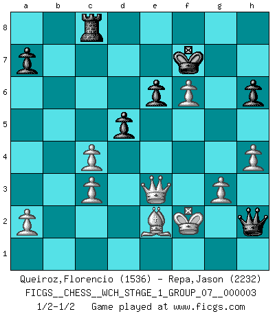 Last move : 1/2-1/2 2007 October 30 16:8:29 [Event "FICGS__CHESS__WCH_STAGE_1_GROUP_07__000003"] [Site "FICGS"] [Date "2007.07.11"] [Round "1"] [White "Queiroz,Florencio"] [Black "Repa,Jason"] [Result "1/2-1/2"] [WhiteElo "1536"] [BlackElo "2232"] 1.e4 e6 2.d4 d5 3.Nc3 Nf6 4.Bg5 Bb4 5.e5 h6 6.Bd2 Bxc3 7.bxc3 Ne4 8.Qg4 g6 9.Bd3 Nxd2 10.Kxd2 c5 11.Nf3 Bd7 12.dxc5 Qa5 13.Rab1 Qxc5 14.Rxb7 Qxf2+ 15.Be2 Nc6 16.Rf1 Qc5 17.Nd4 Nxd4 18.Rxf7 Kxf7 19.Rxd7+ Ke8 20.Rg7 Kd8 21.Qxd4 Rc8 22.Rxg6 Qe7 23.c4 Qb4+ 24.Ke3 Qa3+ 25.Kd2 Qb4+ 26.Ke3 Qa3+ 27.c3 Qc1+ 28.Kf3 Rf8+ 29.Rf6 Rxf6+ 30.exf6 Ke8 31.h4 Qe1 32.g3 Kf7 33.Qe3 Qh1+ 34.Kf2 Qh2+ 35.Kf1 Qh1+ 36.Kf2 Qh2+ 1/2-1/2 French : MacCutcheon, Lasker variation This chess game ended in a draw. Follow this game move after move (download)Pawns are born free, yet they are everywhere in chains. (Rick Kennedy) Vom Schach wurde gesagt das Leben sei dafür nicht lange genug. Aber das ist der Fehler des Lebens, nicht des Schach'. (Irving Chernev) Botvinnik trataba de restarle el misterio al Ajedrez, siempre relacionandolo a situaciones de la vida ordinaria. El gustaba de llamar al Ajedrez un típico problema inexacto similar a aquellos de los cuales la gente siempre tiene que enfrentarse en la vida cotidiana. (Garry Kasparov) Nous sommes les pions de la mystérieuse partie d'Echecs jouée par Dieu. Il nous déplace, nous arrête, nous pousse encore, puis nous lance un à un dans la boîte du Néant. Epitaphe sur la tombe de David Janowsky (1868-1927). Mandala - that's it! 16x16 squares as multiple of the four and the eight because of the Four Noble Truths and the Noble Eightfold Path. (Heinz-Georg Lehnhoff about Big Chess)