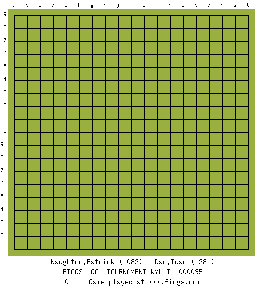 Last move : 0-1 2020 July 8 7:3:11 [Event "FICGS__GO__TOURNAMENT_KYU_I__000095"] [Site "FICGS"] [Date "2020.06.07"] [Round "1"] [Black "Naughton,Patrick"] [White "Dao,Tuan"] [Result "0-1"] [Rating 1 "1082"] [Rating 2 "1281"] 0-1 This go game has been lost on time (started : 2020.06.07 23:4:7) Here are the names of the openings (joseki) played in the four corners : Player White won this Go (weiqi, baduk) game. Follow this game move after move (download)Each step in a ladder is worth 7 points. (Anonymous) Empty your mind, be formless, shapeless — like water. (Bruce Lee)