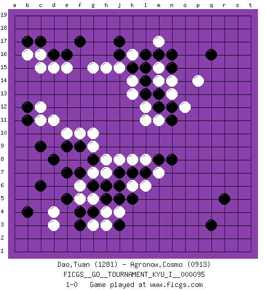 Last move : 1-0 2020 August 29 19:30:38 [Event "FICGS__GO__TOURNAMENT_KYU_I__000095"] [Site "FICGS"] [Date "2020.06.07"] [Round "1"] [Black "Dao,Tuan"] [White "Agronow,Cosmo"] [Result "1-0"] [Rating 1 "1281"] [Rating 2 "0913"] 1.q16 d4 2.q3 c16 3.f3 f5 4.j3 m17 5.c6 f8 6.c9 d11 7.b4 d3 8.e9 f10 9.f9 g9 10.g8 g10 11.f7 e8 12.d8 e10 13.e7 j8 14.j6 h7 15.h6 g7 16.g6 f6 17.g4 g5 18.h5 h8 19.f17 g15 20.j17 k16 21.j16 j15 22.k15 k14 23.l15 l11 24.l14 k13 25.l16 h15 26.e16 e15 27.d16 d15 28.c17 c15 29.b17 b16 30.b11 c12 31.b12 c11 32.r5 l6 33.k7 l8 34.l7 m7 35.m8 k8 36.n8 k6 37.j7 h4 38.j5 g3 39.f4 j4 40.k5 h3 41.e5 n14 42.n15 m15 43.m16 m14 44.n16 p14 45.l13 l12 46.m13 n13 47.m12 m11 48.n12 o12 49.n11 1-0 This go game has been lost on time (started : 2020.06.07 23:4:7) Here are the names of the openings (joseki) played in the four corners : Corner d4 : d4 f3 Hoshi (Hwajeom, Seongjeom, Xingwei`) 4-4 Point. The star or hoshi (4-4) point, emphasizing influence at the potential expense of territory. Ikken Kakari (Hankan Keolch'im, Yi Gua`jiao~, 1-Space Low Approach). Black 2 is the standard approach move to the 4-4. Corner q16 : q16 m17 Hoshi (Hwajeom, Seongjeom, Xingwei`) 4-4 Point. The star or hoshi (4-4) point, emphasizing influence at the potential expense of territory. Player Black won this Go (weiqi, baduk) game. Follow this game move after move (download)Keep away from thickness. (Anonymous) Big Chess is a place for big hallucinations. (Thibault de Vassal)