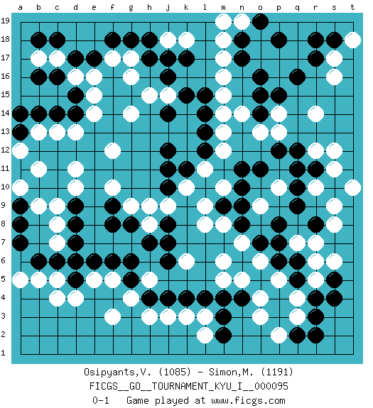 Last move : 0-1 2020 July 24 22:21:36 [Event "FICGS__GO__TOURNAMENT_KYU_I__000095"] [Site "FICGS"] [Date "2020.06.07"] [Round "1"] [Black "Osipyants,Vladimir"] [White "Simon,Mickael"] [Result "0-1"] [Rating 1 "1085"] [Rating 2 "1191"] 1.q16 d4 2.d17 q4 3.d15 r14 4.q12 p14 5.o16 s16 6.r17 s17 7.s18 m17 8.n17 m16 9.n18 m18 10.o14 p13 11.p15 g16 12.j16 g14 13.j14 m14 14.q9 c13 15.c14 d13 16.c6 c5 17.d6 f3 18.d9 f12 19.j12 r7 20.r8 q7 21.r3 q3 22.r4 r5 23.s5 s6 24.q5 r6 25.q2 p2 26.r2 o3 27.s4 p5 28.k4 s12 29.r11 s11 30.s10 s9 31.q10 t10 32.o11 o13 33.l15 m15 34.l14 m13 35.l13 m12 36.n9 m8 37.m9 l8 38.n8 n7 39.m3 j3 40.j4 h3 41.j7 j9 42.g5 l9 43.n11 m6 44.g8 s8 45.p8 d11 46.b14 b13 47.a13 a12 48.a14 b11 49.h17 g17 50.h18 c8 51.d8 c9 52.d5 c4 53.b6 l3 54.l4 k3 55.n4 o4 56.m2 l2 57.f18 n19 58.o19 m19 59.p18 t18 60.r18 b5 61.a9 m5 62.m4 k18 63.k17 j18 64.j17 n14 65.o15 r10 66.p12 k6 67.j6 n5 68.p7 c7 69.d7 f5 70.f6 h5 71.h4 g4 72.g6 e5 73.e6 r12 74.q11 b9 75.a8 a10 76.a7 a5 77.p6 o6 78.q6 e16 79.e17 e15 80.d14 d16 81.c16 c17 82.c18 b17 83.b16 e14 84.b18 h8 85.h7 g9 86.f8 f10 87.j10 k10 88.j11 f17 89.g18 d10 90.j8 h9 91.f9 h15 92.k11 l11 93.l12 j15 94.k15 m10 95.n10 p10 96.o7 o9 0-1 Here are the names of the openings (joseki) played in the four corners : Corner q16 : q16 r14 Hoshi (Hwajeom, Seongjeom, Xingwei`) 4-4 Point. The star or hoshi (4-4) point, emphasizing influence at the potential expense of territory. Ikken Kakari (Hankan Keolch'im, Yi Gua`jiao~, 1-Space Low Approach). White 2 is the standard approach move to the 4-4. Corner q4 : q4 q9 Hoshi (Hwajeom, Seongjeom, Xingwei`) 4-4 Point. The star or hoshi (4-4) point, emphasizing influence at the potential expense of territory. Corner d4 : d4 c6 Hoshi (Hwajeom, Seongjeom, Xingwei`) 4-4 Point. The star or hoshi (4-4) point, emphasizing influence at the potential expense of territory. Ikken Kakari (Hankan Keolch'im, Yi Gua`jiao~, 1-Space Low Approach). Black 2 is the standard approach move to the 4-4. Player White won this Go (weiqi, baduk) game. Follow this game move after move (download)If a formation is symmetrical, play at the center. (Anonymous) Methinks King Thibault should dub Marius Zubac a knight of the square board... I mean table, henceforth addressing him as Sir Marius, and bestow on him a suitable land from the kingdom of FICGS & marry him off to a worthy, fair maiden, lest he slice our heads with his mighty sword in his wrath. (Dinesh De Silva)