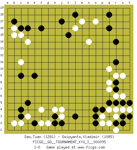 Last move : 1-0 2020 June 14 15:50:19 [Event "FICGS__GO__TOURNAMENT_KYU_I__000095"] [Site "FICGS"] [Date "2020.06.07"] [Round "1"] [Black "Dao,Tuan"] [White "Osipyants,Vladimir"] [Result "1-0"] [Rating 1 "1281"] [Rating 2 "1085"] 1.q16 q4 2.d16 d3 3.d5 f4 4.c3 c2 5.c4 b2 6.c9 d14 7.f16 c11 8.e9 c15 9.c16 b16 10.b17 b15 11.r14 l16 12.j17 o17 13.q18 r6 14.l3 j3 15.o3 p3 16.o4 q10 17.r8 q8 18.h3 j4 19.e2 f2 20.j2 g2 21.h2 h4 22.o2 p2 23.r11 r9 24.l18 m17 25.k15 n14 26.r7 q7 27.r5 s6 28.q5 r4 29.p4 r3 30.s5 s4 31.t5 s9 32.s2 t4 33.r2 q2 34.t3 r1 35.s3 1-0 Here are the names of the openings (joseki) played in the four corners : Corner d4 : d3 d5 Komoku (Somok, Xiao~mu`) 3-4 Point. The komoku (3-4) point is the traditional corner enclosure move.. Ikken Takagakari (Hankan Nop'dakeolch'im, Yi Gaogua`jiao~, 1-Space High Approach). The 5-4 approach move has become more popular in modern times, as modern Go emphasizes speed and influence. Corner d16 : d16 d14 Hoshi (Hwajeom, Seongjeom, Xingwei`) 4-4 Point. The star or hoshi (4-4) point, emphasizing influence at the potential expense of territory. Ikken Takagakari (Hankan Nop'dakeolch'im, Yi Gaojia, 1-Space High Approach). Black typically responds at 6-4 or 3-10. Black 4-10 is played when Black finds play on the right side advantageous. Black 4-8 or 3-8 may be played when Black has support at top. Player Black won this Go (weiqi, baduk) game. Follow this game move after move (download)Everything happens on a grid-engraved board with black and white pieces, but if that's all you see then you don't know Go. (Pierre Audouard) Wisdom begins at the end. (Daniel Webster)