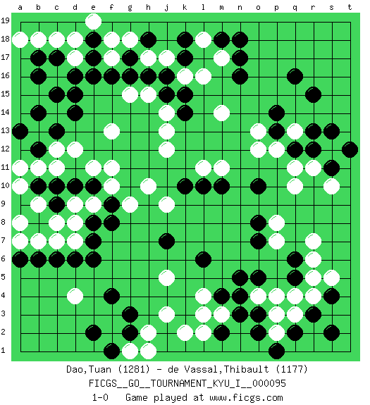 Last move : 1-0 2020 June 30 16:17:38 [Event "FICGS__GO__TOURNAMENT_KYU_I__000095"] [Site "FICGS"] [Date "2020.06.07"] [Round "1"] [Black "Dao,Tuan"] [White "de Vassal,Thibault"] [Result "1-0"] [Rating 1 "1281"] [Rating 2 "1177"] 1.k10 d17 2.d15 d4 3.q16 q4 4.f16 f18 5.c17 c16 6.d16 c18 7.b17 b18 8.e17 d18 9.b16 h17 10.c6 d9 11.e6 d7 12.d6 d12 13.f4 c14 14.c15 l16 15.n17 m17 16.n16 q10 17.r12 r7 18.o3 o4 19.n4 p3 20.o5 p4 21.n5 m3 22.n3 j3 23.g3 l4 24.l6 h2 25.g2 k2 26.m2 l2 27.m4 l3 28.o2 g1 29.f1 h1 30.e2 j5 31.j7 c7 32.b6 b7 33.b14 b13 34.c13 c12 35.d14 p12 36.r15 r11 37.q12 q11 38.p13 s12 39.s13 q13 40.r13 o13 41.p14 o12 42.o10 m14 43.q6 r6 44.q5 r5 45.r3 r4 46.q2 p8 47.o8 p7 48.o7 m11 49.m10 l11 50.l10 j12 51.h16 j17 52.m18 l18 53.n18 h10 54.e18 e19 55.b12 b11 56.a13 g15 57.g16 h15 58.j16 k16 59.j15 j14 60.k15 f13 61.k14 j13 62.f9 g9 63.f8 f10 64.s11 s10 65.t12 f17 66.e16 p2 67.p1 q3 68.s2 j9 69.s4 s5 70.b10 a11 71.d10 c11 72.e10 e9 73.c10 f11 74.b8 a8 75.a9 a7 76.c9 d8 77.a6 a10 78.e7 b9 79.g17 g18 80.a9 e11 81.e8 b9 82.k18 c8 83.k17 a18 84.h18 1-0 Here are the names of the openings (joseki) played in the four corners : Corner d16 : d17 d15 Komoku (Somok, Xiao~mu`) 3-4 Point. The komoku (3-4) point is the traditional corner enclosure move.. Ikken Takagakari (Hankan Nop'dakeolch'im, Yi Gaogua`jiao~, 1-Space High Approach). The 5-4 approach move has become more popular in modern times, as modern Go emphasizes speed and influence. Corner d4 : d4 c6 Hoshi (Hwajeom, Seongjeom, Xingwei`) 4-4 Point. The star or hoshi (4-4) point, emphasizing influence at the potential expense of territory. Ikken Kakari (Hankan Keolch'im, Yi Gua`jiao~, 1-Space Low Approach). Black 2 is the standard approach move to the 4-4. Corner q16 : q16 l16 Hoshi (Hwajeom, Seongjeom, Xingwei`) 4-4 Point. The star or hoshi (4-4) point, emphasizing influence at the potential expense of territory. Player Black won this Go (weiqi, baduk) game. Follow this game move after move (download)Strike at the waist of the knight's move. (Anonymous) The Internet is the world's largest library. It's just that all the books are on the floor. (John Allen Paulos)