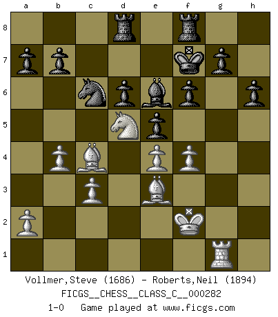 Last move : 1-0 2020 December 9 13:13:14 [Event "FICGS__CHESS__CLASS_C__000282"] [Site "FICGS"] [Date "2020.06.08"] [Round "1"] [White "Vollmer,Steve"] [Black "Roberts,Neil"] [Result "1-0"] [WhiteElo "1686"] [BlackElo "1894"] 1.e4 c5 2.Nf3 Nc6 3.d4 cxd4 4.Nxd4 Nf6 5.Nc3 e5 6.Nde2 Bc5 7.Ng3 O-O 8.Bc4 d6 9.O-O Ng4 10.Nd5 Qh4 11.h3 Nxf2 12.Rxf2 Qxg3 13.Qf3 Qxf3 14.gxf3 Bxf2+ 15.Kxf2 Bxh3 16.Be3 Be6 17.c3 f6 18.Rh1 Rad8 19.b4 h6 20.Rg1 Kf7 21.f4 1-0 This chess game has been lost on time (started : 2020.06.08 4:50:5) Follow this game move after move (download)You cannot play at Chess if you are kind-hearted. (French Proverb) Ich spiele ehrlich und spiele, um zu gewinnen. Wenn ich verliere nehme ich meine Medizin. (Robert James Fischer) Un Peón pasado es un criminal, quién debe ser mantenido bajo candado y llave. Leves medidas, tales como vigilancia policiaca, no son suficientes. (Aaron Nimzovich) Il s'avisa de me proposer d'apprendre les échecs qu'il jouait un peu... me voilà forcené des échecs. J'achète un échiquier, je m'enferme dans ma chambre, j'y passe des jours et des nuits à vouloir apprendre par cur toutes les parties. (Jean-Jacques Rousseau, Confessions) Just because you do not take an interest in politics doesn't mean politics won't take an interest in you. (Pericles 430 B.C.)