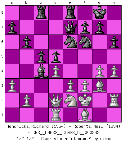 Last move : 1/2-1/2 2020 September 19 20:31:24 [Event "FICGS__CHESS__CLASS_C__000282"] [Site "FICGS"] [Date "2020.06.08"] [Round "1"] [White "Hendricks,Richard"] [Black "Roberts,Neil"] [Result "1/2-1/2"] [WhiteElo "1954"] [BlackElo "1894"] 1.d4 Nf6 2.c4 e6 3.Nc3 Bb4 4.Qc2 O-O 5.a3 Bxc3+ 6.Qxc3 b6 7.Bg5 Bb7 8.f3 d5 9.cxd5 exd5 10.e3 Re8 11.Ne2 Nbd7 12.h4 Nf8 13.g4 h6 14.Bf4 Rc8 15.Qd2 c5 16.Kf2 Ba6 17.Rd1 Ne6 18.Bg3 Qe7 19.Rh2 Bc4 1/2-1/2 Nimzo-Indian : Classical variation Kingside Castling by player Black (move 4) This chess game ended in a draw. Follow this game move after move (download)When you see a good move, look for a better one. (Emanuel Lasker) Auf Remis zu spielen ist gewissermaßen ein Verbrechen gegen das Schachspiel. (Mikhail Nekhemyevich Tal) La caracteristica mas importante en la posición del Ajedrez es la actividad de las piezas. Esto es absolutamente fundamental en todas las fases del juego: Apertura, Juego Medio y especialmente Finales. La limitación primordial en la actividad de una pieza, es la estructuración de los Peones. (Michael Stean) La vie et les Echecs sont tous les deux une lutte constante. (Lasker) I'm extremely disappointed. I send you out for exciting, new designer drugs, you come back with tomato sauce. (Gregory House, House M.D.)