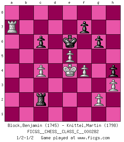 Last move : 1/2-1/2 2020 December 1 18:9:17 [Event "FICGS__CHESS__CLASS_C__000282"] [Site "FICGS"] [Date "2020.06.08"] [Round "1"] [White "Block,Benjamin"] [Black "Knittel,Martin"] [Result "1/2-1/2"] [WhiteElo "1745"] [BlackElo "1798"] 1.e4 e5 2.Nf3 Nc6 3.Bb5 Nf6 4.O-O Nxe4 5.d4 Nd6 6.Bxc6 dxc6 7.dxe5 Nf5 8.Qxd8+ Kxd8 9.Nc3 Be7 10.h3 Nh4 11.Nxh4 Bxh4 12.Be3 h5 13.Rad1+ Ke8 14.Ne2 Be7 15.Rd2 h4 16.b3 Bd7 17.f4 g6 18.Nd4 c5 19.Ne2 Bf5 20.Kf2 b6 21.Nc3 c6 22.Kf3 c4 23.Ne4 Be6 24.Rfd1 cxb3 25.axb3 b5 26.Bc5 Bd5 27.Ke3 a5 28.Ra1 Bxe4 29.Bxe7 Kxe7 30.Kxe4 Rhd8 31.Rxd8 Rxd8 32.Rxa5 Rd2 33.Ra7+ Ke6 34.c4 bxc4 35.bxc4 Rc2 1/2-1/2 Follow this game move after move (download)One doesn't have to play well, it's enough to play better than your opponent. (Siegbert Tarrasch) Man kann eine Schachpartie nur gewinnen, wenn das Gleichgewicht gestört ist. In einer Stellung mit ungestörtem Gleichgewicht ist auch das größte Genie hilflos - in der Stellung steckt dann eben kein genialer Einfall. (Wilhelm Steinitz) Nunca antes ha habido un jugador de Ajedrez con tal conocimiento a fondo de las complejidades del juego y una inmensa voluntad absolutamente indomable de ganar. Yo pienso que Fischer es el jugador mas grande que jamás haya existido. (Lisa Lane) Les Echecs ont trois composantes : le temps, l'espace et le matériel en dernier. (Mikhail Tal) Logic : The art of thinking and reasoning in strict accordance with the limitations and incapacities of the human misunderstanding. (Ambrose Bierce)