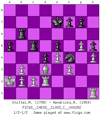 Last move : 1/2-1/2 2020 September 21 10:8:14 [Event "FICGS__CHESS__CLASS_C__000282"] [Site "FICGS"] [Date "2020.06.08"] [Round "1"] [White "Knittel,Martin"] [Black "Hendricks,Richard"] [Result "1/2-1/2"] [WhiteElo "1798"] [BlackElo "1954"] 1.e4 c5 2.Nc3 a6 3.Nf3 d6 4.d4 cxd4 5.Nxd4 Nf6 6.Be3 e5 7.Nb3 Be6 8.f3 Be7 9.Qd2 O-O 10.O-O-O Nbd7 11.g4 b5 12.g5 b4 13.Na4 Nh5 14.Qxb4 d5 15.Qa5 Qxa5 16.Nxa5 d4 17.Nc6 Bd6 18.Kb1 Rfc8 19.Na5 Bb4 20.Bd2 Bxd2 21.Rxd2 Rab8 22.Ka1 Nc5 23.Nxc5 Rxc5 24.Nb3 Bxb3 25.axb3 a5 26.Ka2 Nf4 27.h4 Kf8 28.Bd3 Rb6 29.Bf1 h5 30.Bd3 Ke7 1/2-1/2 Sicilian : Closed Kingside Castling by player Black (move 9) Queenside Castling by player White (move 10) This chess game ended in a draw. Follow this game move after move (download)If you aren't afraid of Spassky, then I have removed the element of money. (Jim Slater) Wenn ich gewinne bin ich ein Genie. Wenn nicht, dann bin ich keines. (Robert James Fischer) Siempre es mucho mejor sacrificar las piezas de tu oponente. (Savielly Tartakover) Les échecs sont plus proches de l'art de l'assassinat que de l'art de la guerre. (Arturo Perez-Reverte) Life is pain my dear and anyone who says otherwise is selling something. (Princess Bride)
