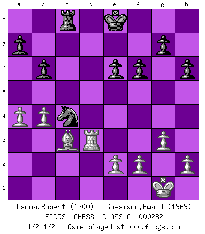 Last move : 1/2-1/2 2020 July 14 18:20:56 [Event "FICGS__CHESS__CLASS_C__000282"] [Site "FICGS"] [Date "2020.06.08"] [Round "1"] [White "Csoma,Robert"] [Black "Gossmann,Ewald"] [Result "1/2-1/2"] [WhiteElo "1700"] [BlackElo "1969"] 1.d4 Nf6 2.c4 e6 3.Nc3 Bb4 4.Qc2 O-O 5.a3 Bxc3+ 6.Qxc3 d5 7.Nf3 dxc4 8.Qxc4 b6 9.g3 Bb7 10.Bg2 Bd5 11.Qc3 Nbd7 12.O-O c5 13.dxc5 Nxc5 14.b4 Nfe4 15.Qe3 Na4 16.Nd2 Nxd2 17.Bxd2 Bxg2 18.Kxg2 Rc8 19.Rfc1 Qd5+ 20.Kg1 h6 21.Be1 Nb2 22.Bc3 Nc4 23.Qd4 Qxd4 24.Bxd4 Rfd8 25.Bc3 f6 26.a4 Kf7 27.Rd1 Rxd1+ 28.Rxd1 Ke8 29.Rd3 1/2-1/2 Nimzo-Indian : Classical variation Kingside Castling by player Black (move 4) Kingside Castling by player White (move 12) This chess game ended in a draw. Follow this game move after move (download)Those who say they understand Chess, understand nothing. (Robert Hubner) Obendrein hat der FIDE-Präsident den Revolutionsführer Gaddafi zum »Großmeister« ernannt, am Ende der WM. Das ist lächerlich! (Joel Lautier) La belleza de un movimiento no se refleja solo en su apariencia, sino en el pensamiento detrás de él. (Siegbert Tarrasch) On est toujours la mazette de quelqu'un d'autre. (Anonyme) If you work for a living, why do you kill yourself working ? (Tuco to a chicken in The Good, The Bad and The Ugly)