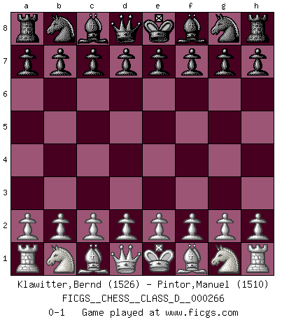 Last move : 0-1 2020 July 18 6:54:11 [Event "FICGS__CHESS__CLASS_D__000266"] [Site "FICGS"] [Date "2020.06.08"] [Round "1"] [White "Klawitter,Bernd"] [Black "Pintor,Manuel"] [Result "0-1"] [WhiteElo "1526"] [BlackElo "1510"] 0-1 This chess game has been lost on time (started : 2020.06.08 5:49:6) Player Black won this chess game. Follow this game move after move (download)Many have become Chess Masters, no one has become the Master of Chess. (Siegbert Tarrasch) Pläne sind die Träume des Verständigen. (Ernst Freiherr von Feuchtersleben) Todavía soy una víctima del Ajedrez. Tiene toda la belleza del arte y mucho mas. No puede ser comercializado. El Ajedrez es mas puro que el arte en su posición social. (Marcel Duchamp) Aux échecs, les retours au sommet sont rares : les dommages psychologiques consécutifs à une défaite sont trop sévères. (Daily Telegraph) Optimism is a variety of information deficit. Sometimes especially true for correspondence chess games. (Michael Aigner)