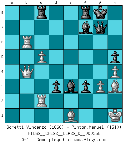 Last move : 0-1 2020 July 7 6:13:11 [Event "FICGS__CHESS__CLASS_D__000266"] [Site "FICGS"] [Date "2020.06.08"] [Round "1"] [White "Soretti,Vincenzo"] [Black "Pintor,Manuel"] [Result "0-1"] [WhiteElo "1668"] [BlackElo "1510"] 1.d4 d5 2.c4 c6 3.e3 Nf6 4.Nc3 Bf5 5.Nf3 e6 6.Be2 Ne4 7.O-O Be7 8.Nxe4 Bxe4 9.Nd2 Bg6 10.b3 O-O 11.a4 Nd7 12.c5 b6 13.b4 e5 14.Nb3 e4 15.Ba6 bxc5 16.Nxc5 Nxc5 17.dxc5 Bf6 18.Rb1 Be5 19.Re1 Qf6 20.Bd2 Qh4 21.g3 Qh3 22.Bf1 Qh6 23.Be2 a6 24.b5 axb5 25.axb5 cxb5 26.Rxb5 f5 27.Qb3 Bf7 28.Qb4 g5 29.Rb6 Qg7 30.Rb1 f4 31.exf4 gxf4 32.Be1 Bd4 33.Kh1 f3 34.Bf1 h5 35.h4 Rac8 36.Rc1 e3 37.fxe3 Bxe3 38.Rc2 d4 39.Bh3 d3 0-1 QGD Slav defense Kingside Castling by player White (move 7) Kingside Castling by player Black (move 10) Player Black won this chess game. Follow this game move after move (download)Fischer wanted to give the Russians a taste of their own medicine. (Larry Evans) Schach ist eine Sache der genauen Beurteilung, wann man zuschlagen und wann man sich ducken muss. (Robert James Fischer) ¿Esta Bobby Fischer algo cuerdo?. (Salo Flohr) La tactique, c'est ce que vous faites quand il y a quelque chose à faire; la stratégie, c'est ce que vous faites quand il n'y a rien à faire. (Savielli Tartacower) I couldn't make any sense out of what this particular thread is about. It sounds like R2 D2 computer speaking. A space fight ?!? Some 'command' problems in Moscow ? Some killers & narcotic addicts attacking some game & a god wannabe ?? (Dinesh De Silva, lost in a russian conflict in FICGS forum)