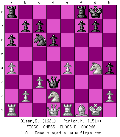 Last move : 1-0 2020 June 17 14:35:25 [Event "FICGS__CHESS__CLASS_D__000266"] [Site "FICGS"] [Date "2020.06.08"] [Round "1"] [White "Olsen,Sverre Eugen"] [Black "Pintor,Manuel"] [Result "1-0"] [WhiteElo "1621"] [BlackElo "1510"] 1.e4 e5 2.Nf3 Nc6 3.d4 exd4 4.Nxd4 Qf6 5.Be3 Bc5 6.c3 d6 7.Bb5 Nge7 8.O-O O-O 9.f4 Bd7 10.Nc2 Bxe3+ 11.Nxe3 a6 12.Bd3 Qh4 13.Nd2 Ng6 14.g3 Qh3 15.a4 h5 16.Re1 h4 17.g4 Nxf4 18.Bf1 Bxg4 19.Nxg4 Ng2 20.Bxg2 Qd3 21.Bf1 1-0 Scotch game Kingside Castling by player White (move 8) Kingside Castling by player Black (move 8) Player White won this chess game. Follow this game move after move (download)Chess is above all, a fight ! (Emanuel Lasker) Ein bischen Romantik kann weder im Schach noch in der Liebe schaden. Also versuche ich mich ab und zu daran zu erinnern. (Nigel Short) Aquellos que dicen que entienden al Ajedrez, no entienden nada. (Robert Hubner) Ce qui caractérise les parties de combat, c'est que si le défenseur a constamment de difficiles problèmes à résoudre, l'attaquant doit chercher sans relâche de nouvelles possibilités d'attaque. (Koblentz) It's not enough to succeed. Others must fail. (Gore Vidal)