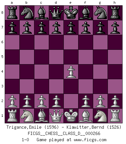 Last move : 1-0 2020 July 18 19:37:3 [Event "FICGS__CHESS__CLASS_D__000266"] [Site "FICGS"] [Date "2020.06.08"] [Round "1"] [White "Trigance,Emile"] [Black "Klawitter,Bernd"] [Result "1-0"] [WhiteElo "1596"] [BlackElo "1526"] 1.e4 1-0 This chess game has been lost on time (started : 2020.06.08 5:49:6) King's pawn Opening Player White won this chess game. Follow this game move after move (download)Bobby Fischer is the greatest Chess player who has ever lived. (Ken Smith) Im Internet Chess Club betrug mein Rating vorübergehend 3350 ELO-Punkte. (Sergej Karjakin) Cuando tengas duda... ¡juega al Ajedrez!. (Tevis) Toutes choses étant égales, c'est la conviction qui gagne. Alliée à une volonté de vaincre, elle sert de détonateur, suscite des idées, disperse les doutes et aide à penser clairement. (Robert Fischer) Are you threatening me, Master Jedi ? (Chancellor Palpatine in Star Wars ep.3)