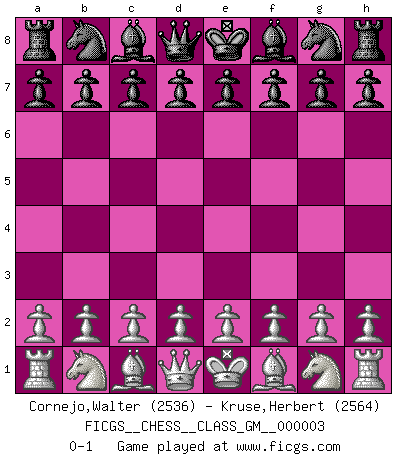 Last move : 0-1 2020 July 18 19:37:3 [Event "FICGS__CHESS__CLASS_GM__000003"] [Site "FICGS"] [Date "2020.06.08"] [Round "1"] [White "Cornejo,Walter"] [Black "Kruse,Herbert"] [Result "0-1"] [WhiteElo "2536"] [BlackElo "2564"] 0-1 This chess game has been lost on time (started : 2020.06.08 13:13:25) Player Black won this chess game. Follow this game move after move (download)Chess is thirty to forty percent psychology. You don't have this when you play a computer. I can't confuse it. (Judith Polgar) Du kannst im Schach nur gut werden, wenn du das Spiel liebst. (Robert James Fischer) No hay otro maestro que tenga una voluntad terrífica de ganar. Al tablero, el irradía peligro y aún los oponentes mas fuertes tienden a congelarse como liebres cuando olfatean a una pantera. Aún sus debilidades son peligrosas. Con las blancas, su juego de apertura es predecible - te es posible hacer planes en su contra - pero es tan fuerte que tus planes casi nunca funcionan. En el juego medio, su precisión e invención son fabulosas y en finales, tú simplemente no le puedes vencer. (Experto Alemán anónimo) Les échecs sont un jeu par leur forme, un art par leur essence et une science par sa difficulté d'acquisition. Ils peuvent vous procurer autant de plaisir qu'un bon livre ou une belle musique, mais vous n'aurez une réelle joie que si vous arrivez à bien jouer. (Tigran Petrosian) Good decisions come from experience, and experience comes from bad decisions. (Anonymous)