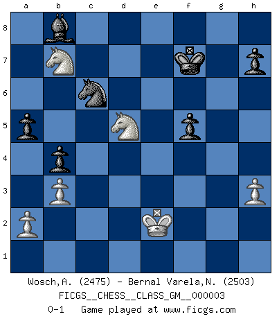 Last move : 0-1 2021 March 11 7:23:26 [Event "FICGS__CHESS__CLASS_GM__000003"] [Site "FICGS"] [Date "2020.06.08"] [Round "1"] [White "Wosch,Arkadiusz"] [Black "Bernal Varela,Nelson"] [Result "0-1"] [WhiteElo "2475"] [BlackElo "2503"] 1.e4 e6 2.d4 d5 3.Nc3 Nf6 4.Bg5 dxe4 5.Nxe4 Be7 6.Bxf6 gxf6 7.Nf3 f5 8.Nc3 a6 9.g3 b5 10.Bg2 Bb7 11.O-O c5 12.dxc5 Qxd1 13.Raxd1 Bxc5 14.Ne5 Ra7 15.Rfe1 Be7 16.Bxb7 Rxb7 17.Ne2 O-O 18.Kf1 b4 19.b3 Rc8 20.Nf4 Rxc2 21.Re2 Rbc7 22.h3 R7c3 23.Nc4 Rxe2 24.Kxe2 Rc2+ 25.Rd2 Rxd2+ 26.Nxd2 Nc6 27.Nc4 Nd4+ 28.Kd3 Nc6 29.Kd2 Bg5 30.Ne3 Kg7 31.Nd3 Be7 32.f3 f6 33.g4 fxg4 34.fxg4 Kf7 35.Nc4 f5 36.gxf5 exf5 37.Ke2 Bd8 38.Nd6+ Kf6 39.Nc4 Bc7 40.Ne3 Kg6 41.Nc4 a5 42.Nc5 Ne5 43.Ne3 Bb8 44.Nd5 Kf7 45.Nb7 Nc6 0-1 Follow this game move after move (download)Is Bobby Fischer quite sane ? (Salo Flohr) Über die Verhaftung Bobby Fischers: Warum es die Bush-Administration für nötig befindet einen 61 Jahre alten Mann zu hetzten, der für niemanden ausser sich selbste eine Gefahr darstellt ist ein Rätsel. (Nigel Short) El Ajedrez es un invernadero donde los frutos del carácter pueden madurar mas completamente que en la vida. (Edward Morgan Foster) Si rien de grave n'est détecté lors de l'analyse d'une position, on joue alors le coup. Seconde règle de Blumenfeld. It's not a bug - it's an undocumented feature. (Anonymous)