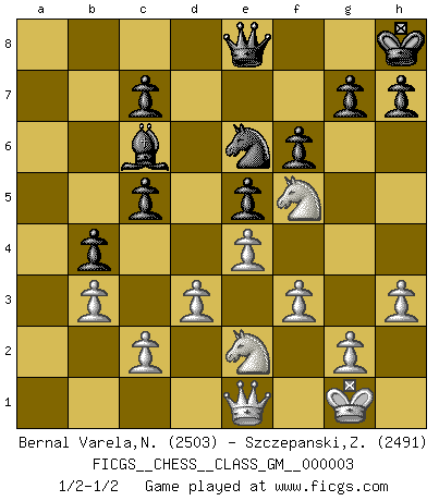 Last move : 1/2-1/2 2020 November 1 0:19:51 [Event "FICGS__CHESS__CLASS_GM__000003"] [Site "FICGS"] [Date "2020.06.08"] [Round "1"] [White "Bernal Varela,Nelson"] [Black "Szczepanski,Zbigniew"] [Result "1/2-1/2"] [WhiteElo "2503"] [BlackElo "2491"] 1.e4 e5 2.Nf3 Nc6 3.Bb5 Nf6 4.d3 Bc5 5.Bxc6 dxc6 6.O-O Nd7 7.Nc3 O-O 8.a4 a5 9.h3 Re8 10.Nd2 Nf8 11.Nc4 b6 12.Qf3 f6 13.Ne2 Ne6 14.b3 Qd7 15.Ne3 Qf7 16.Bd2 Kh8 17.Nf5 Bd7 18.Kh1 Bb4 19.Bxb4 axb4 20.Qg3 c5 21.f3 Qg6 22.Qh2 b5 23.axb5 Rxa1 24.Rxa1 Qg5 25.Rd1 Ra8 26.Qg1 Bxb5 27.Ra1 Rxa1 28.Qxa1 Qh5 29.Kg1 Bc6 30.Qe1 Qe8 1/2-1/2 Ruy Lopez : Berlin defense Kingside Castling by player White (move 6) Kingside Castling by player Black (move 7) This chess game ended in a draw. Follow this game move after move (download)By the beauty of his games, the clarity of his play, and the brilliance of his ideas, Fischer made himself an artist of the same stature as Brahms, Rembrandt, and Shakespeare. (David Levy) Ohne Leiden bildet sich kein Charakter. (Ernst Freiherr von Feuchtersleben) En la perfecta combinación de Ajedrez como en una historia corta de primera clase, toda la trama y contra trama deberá conducir hacia un final sorprendente, el interes no es mitigado hasta el último momento. (Yates and Winter) A ce moment-là, je menaçais de comprendre la position ! (Clément L'Heureux) Be who you are, and say what you feel because those who mind don't matter, and those who matter don't mind. (Dr Seuss)