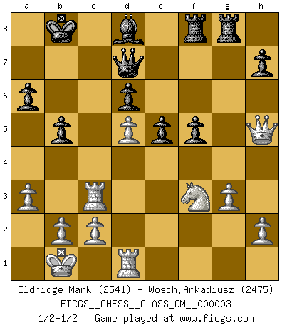 Last move : 1/2-1/2 2020 November 4 22:8:31 [Event "FICGS__CHESS__CLASS_GM__000003"] [Site "FICGS"] [Date "2020.06.08"] [Round "1"] [White "Eldridge,Mark"] [Black "Wosch,Arkadiusz"] [Result "1/2-1/2"] [WhiteElo "2541"] [BlackElo "2475"] 1.e4 c5 2.Nf3 Nc6 3.d4 cxd4 4.Nxd4 Nf6 5.Nc3 d6 6.Bg5 e6 7.Qd2 a6 8.O-O-O Bd7 9.f4 Be7 10.Nf3 b5 11.Bxf6 gxf6 12.Kb1 Qb6 13.Bd3 O-O-O 14.Rhe1 Kb8 15.Nd5 exd5 16.exd5 Ne5 17.fxe5 fxe5 18.Qh6 Qc5 19.Qh5 Rdf8 20.Bf5 Qc8 21.Bxd7 Qxd7 22.g3 Bd8 23.Re3 Rhg8 24.Rc3 f5 25.a3 1/2-1/2 Follow this game move after move (download)When the Chess game is over, the Pawn and the King go back to the same box. (Irish saying) Früher wurde jeder komplizierte Zug, jedes interessante Opfer mit großem Beifall und Enthusiasmus aufgenommen. Heute schaltet man einfach seinen Fritz an, und man kann sehen, was los ist, ob der Zug geht oder nicht. (Vladimir Kramnik) Bobby Fischer es el mas grande genio de Ajedrez de todos los tiempos. (Alexander Kotov) Plusieurs personnes se sont demandées comment Tal faisait pour gagner... En fait, c'est très simple ! Il met ses pièces au centre de l'échiquier et les sacrifie quelque part ! (David Bronstein) Memory... is the diary that we all carry with us. (Oscar Wilde, The Importance of Being Earnest)