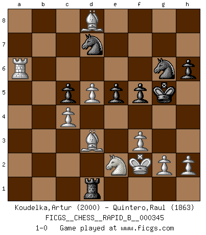 Last move : 1-0 2020 August 31 3:55:20 [Event "FICGS__CHESS__RAPID_B__000345"] [Site "FICGS"] [Date "2020.06.08"] [Round "1"] [White "Koudelka,Artur"] [Black "Quintero,Raul"] [Result "1-0"] [WhiteElo "2000"] [BlackElo "1863"] 1.e4 b6 2.d4 Bb7 3.Bd3 e6 4.c4 Bb4+ 5.Bd2 a5 6.Ne2 Ne7 7.Nbc3 d6 8.a3 Bxc3 9.Bxc3 O-O 10.O-O Nd7 11.b4 axb4 12.axb4 c5 13.bxc5 bxc5 14.Rxa8 Qxa8 15.d5 e5 16.Qc2 Ng6 17.Qb3 Rb8 18.Ra1 Ba6 19.Qa4 Qb7 20.Qxa6 Qxa6 21.Rxa6 Rb6 22.Ra7 Ngf8 23.Ba5 Rb3 24.Nc3 g6 25.f3 Kg7 26.Be2 Rb2 27.Bc7 Rc2 28.Ra3 Rc1+ 29.Kf2 f5 30.Bxd6 Kf6 31.Bd3 h6 32.exf5 gxf5 33.Bc7 Ng6 34.Ne2 Rd1 35.Ra6+ Kg5 36.Bd8+ 1-0 Owen defense Kingside Castling by player Black (move 9) Kingside Castling by player White (move 10) Player White won this chess game. Follow this game move after move (download)The mistakes are there, waiting to be made. (Savielly Tartakower) Wenn du nicht weißt was du tun sollst, warte bis dein Gegner eine Idee hat. Sie wird sicher schlecht sein. (Siegbert Tarrasch) En la vida, como en el Ajedrez, los Peones propios obstruyen nuestro camino. La gran fortuna de un hombre, su comodidad, placer, hijos, libros, que deberían ayudarle a ganar, con mucha frecuencia lo ponen en Jaque Mate. (Charles Buxton) Les échecs, c'est la lutte contre l'erreur. (Johannes Zukertort) Life is painting a picture, not doing a sum. (Oliver Wendell Holmes, Jr.)