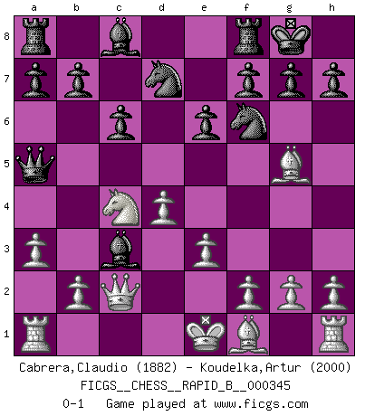 Last move : 0-1 2020 July 16 23:49:20 [Event "FICGS__CHESS__RAPID_B__000345"] [Site "FICGS"] [Date "2020.06.08"] [Round "1"] [White "Cabrera,Claudio"] [Black "Koudelka,Artur"] [Result "0-1"] [WhiteElo "1882"] [BlackElo "2000"] 1.Nf3 d5 2.d4 Nf6 3.c4 c6 4.Nc3 e6 5.Bg5 Nbd7 6.e3 Qa5 7.Nd2 Bb4 8.Qc2 O-O 9.a3 dxc4 10.Nxc4 Bxc3+ 0-1 Reti Opening Kingside Castling by player Black (move 8) Player Black won this chess game. Follow this game move after move (download)The combination player thinks forward; he starts from the given position, and tries the forceful moves in his mind. (Emanuel Lasker) In der Schule lernt man nichts. Es ist nur Zeitverschwendung. (Robert James Fischer) En posiciones complicadas, Bobby Fischer pocas veces tuvo que temer de cualquiera. (Paul Keres) Les échecs sont utiles à l'exercice de la faculté de penser et à celle de l'imagination. Car nous devons posséder une méthode élaborée pour atteindre des buts partout où nous devons conduire notre raison. (Leibnitz) The project of the man are lower than those of the sky. (Chinese proverb)