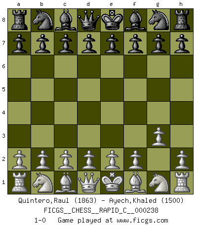 Last move : 1-0 2020 July 9 11:7:22 [Event "FICGS__CHESS__RAPID_C__000238"] [Site "FICGS"] [Date "2020.06.09"] [Round "1"] [White "Quintero,Raul"] [Black "Ayech,Khaled"] [Result "1-0"] [WhiteElo "1863"] [BlackElo "1500"] 1.g3 1-0 This chess game has been lost on time (started : 2020.06.09 1:12:36) Benko's Opening Player White won this chess game. Follow this game move after move (download)The hallmark of the artist is simplicity. (Larry Evans) Ein Gewinn durch eine ungenaue Kombination, sei sie auch noch so vorzeigbar, erfüllt mich mit Schaudern. (Wilhelm Steinitz) Yo considero que Fischer es uno de los expertos mas grandes de aperturas de siempre. (Keith Hayward) Je menace de comprendre la position. (Anonyme) Over-the-board chess is the favorite of mortals, correspondence chess is the favorite of the gods. (Eduard Dyckhoff)